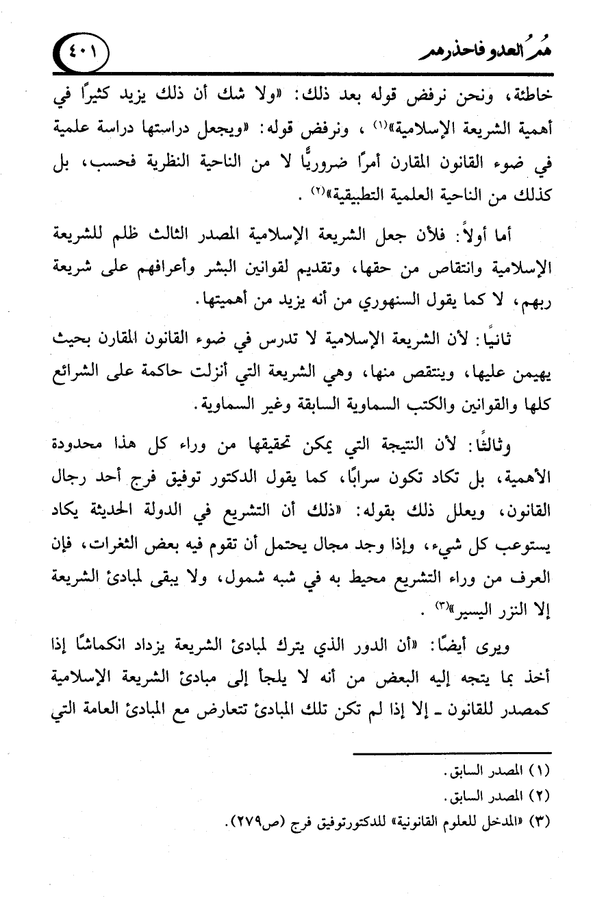 خاطئة، ونحن نرفض قوله بعد ذلك: "ولا شك أن ذلك يزيد كثيرًا في أهمية الشريعة الإسلامية" (1)، ونرفض قوله: "ويجعل دراستها دراسة علمية في ضوء القانون المقارن أمرًا ضروريًّا لا من الناحية النظرية فحسب، بل كذلك من الناحية العلمية التطبيقية" (2).