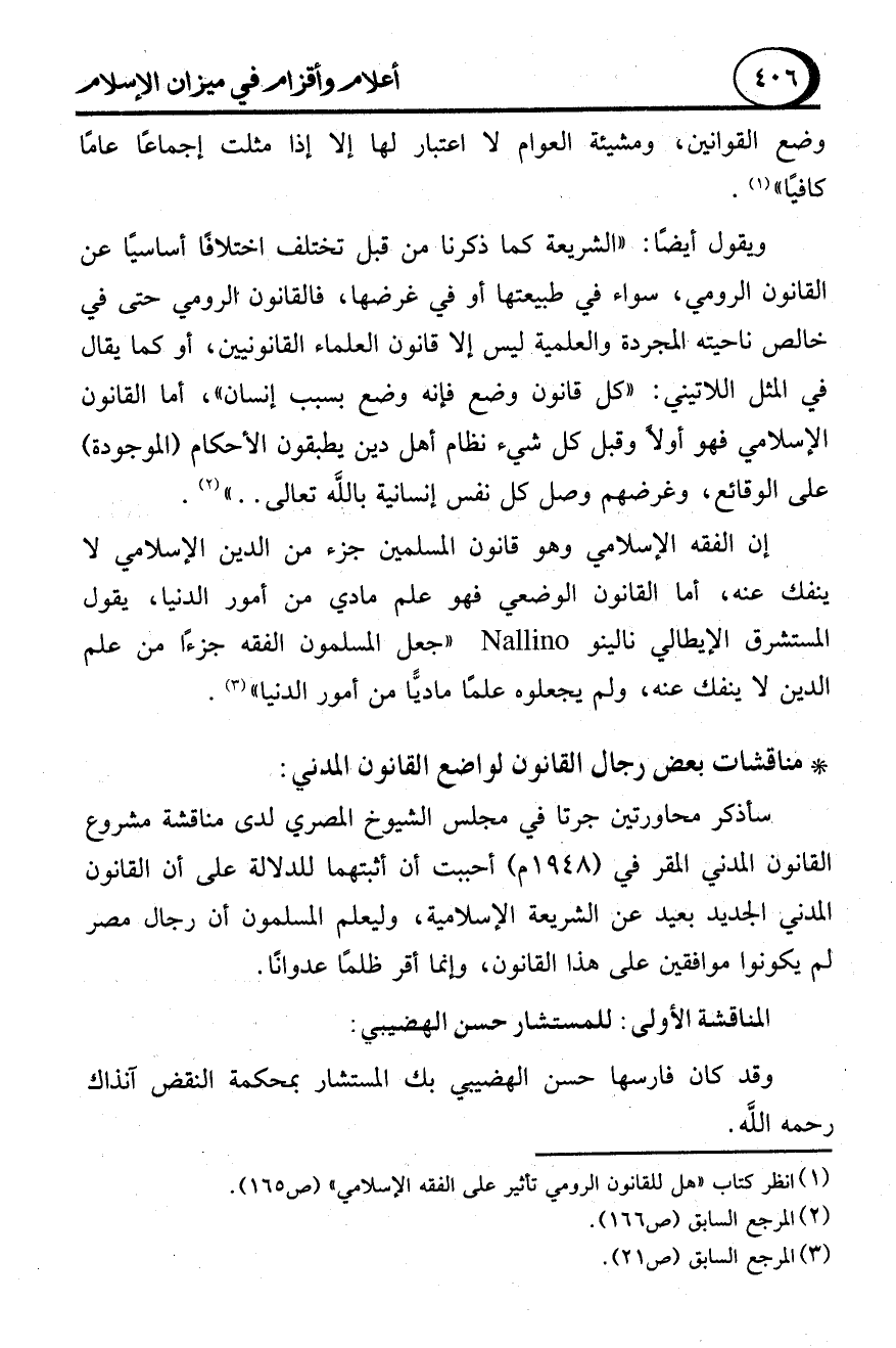 سأذكر محاورتين جرتا في مجلس الشيوخ المصري لدى مناقشة مشروع القانون المدني المقر في (1948 م) أحببت أن أثبتهما للدلالة على أن القانون المدني الجديد بعيد عن الشريعة الإسلامية، وليعلم المسلمون أن رجال مصر لم يكونوا موافقين على هذا القانون، وإنما أقر ظلمًا عدوانًا.
