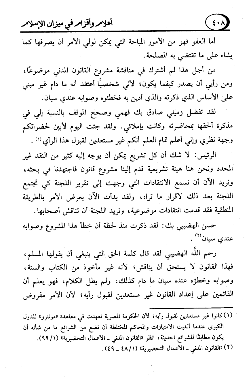 من أجل هذا لم أشترك في مناقشة مشروع القانون المدني موضوعًا، ومن رأيي أن يصدر كيفما يكون؛ لأني شخصيًّا أعتقد أنه ما دام غير مبني على الأساس الذي ذكرته والذي أدين به فخطئوه وصوابه عندي سيان.
