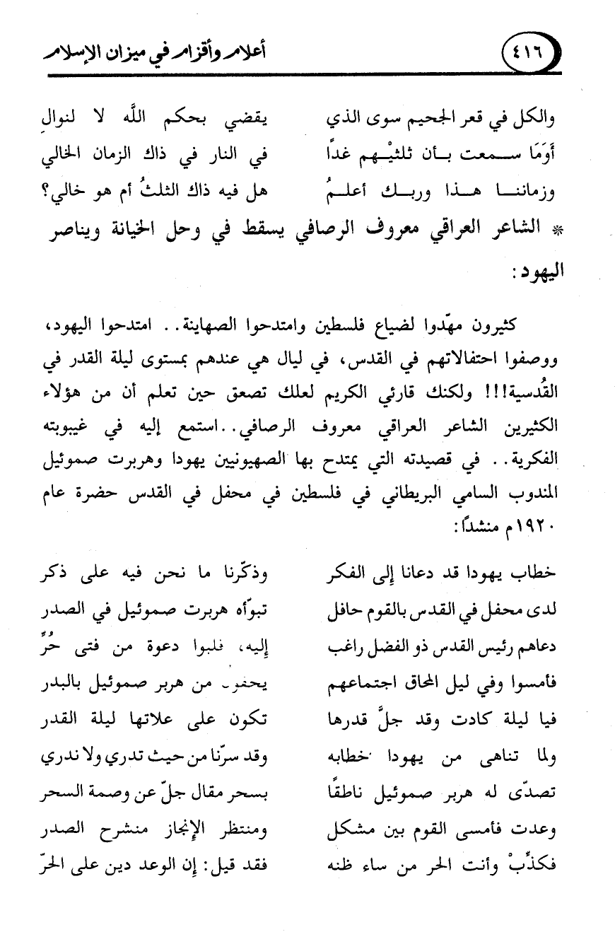 كثيرون مهدوا لضياع فلسطين وامتدحوا الصهاينة .. امتدحوا اليهود، ووصفوا احتفالاتهم في القدس، في ليال هي عندهم بمستوى ليلة القدر في القُدسية!!! ولكنك قارئي الكريم لعلك تصعق حين تعلم أن من هؤلاء الكثيرين الشاعر العراقي معروف الرصافي .. استمع إليه في غيبوبته الفكرية .. في قصيدته التي يمتدح بها الصهيونيين يهودا وهربرت صموئيل المندوب السامي البريطاني في فلسطين في محفل في القدس حضرة عام 1920 م منشدًا: