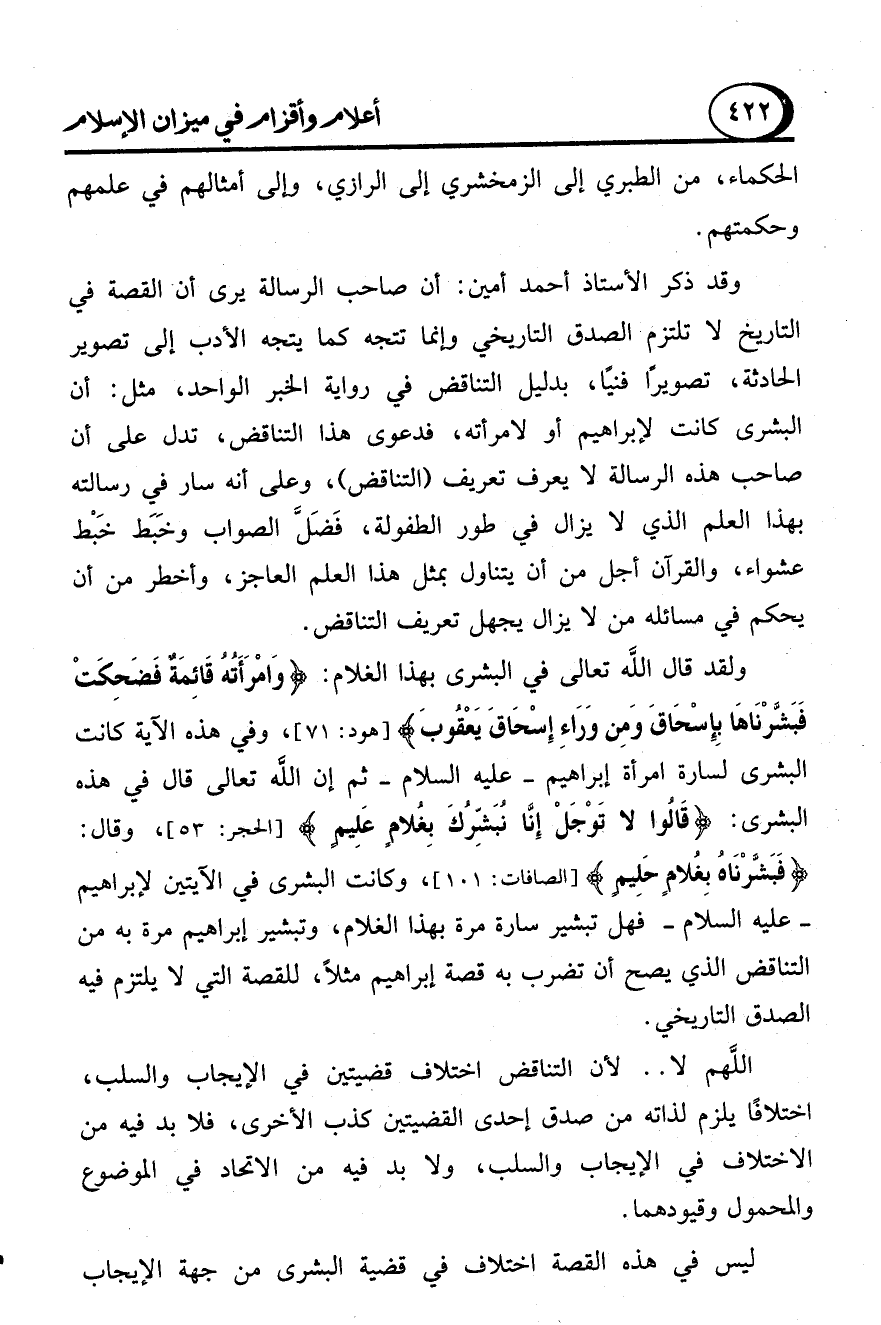وقد ذكر الأستاذ أحمد أمين: أن صاحب الرسالة يرى أن القصة في التاريخ لا تلتزم الصدق التاريخي وإنما تتجه كما يتجه الأدب إلى تصوير الحادثة، تصويرًا فنيًا، بدليل التناقض في رواية الخبر الواحد، مثل: أن البشرى كانت لإبراهيم أو لامرأته، فدعوى هذا التناقض، تدل على أن صاحب هذه الرسالة لا يعرف تعريف (التناقض)، وعلى أنه سار في رسالته بهذا العلم الذي لا يزال في طور الطفولة، فَضلَّ الصواب وخَبَط خَبْط عشواء، والقرآن أجل من أن يتناول بمثل هذا العلم العاجز، وأخطر من أن يحكم في مسائله من لا يزال يجهل تعريف التناقض.