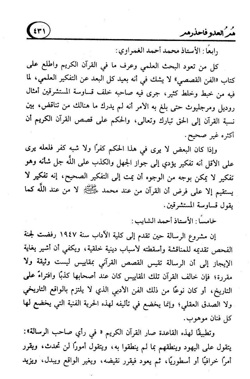 إن مشروع الرسالة حين تقدم إلى كلية الآداب سنة 1947 رفضت لجنة الفحص تقديمه للمناقشة وأسقطته لأسباب دينية خلقية، ويكفي أن أشير بغاية الإيجاز إلى أن الرسالة تقيس القصص القرآني بمقاييس ليست وثيقة ولا مقررة؛ فإن خالف القرآن تلك المقاييس كان عند أصحابها كذبًا وافتراء على التاريخ، أو كان نوعًا من ذلك الفن الأدبي الذي لا يلتزم بالواقع التاريخي ولا الصدق العقلي؛ وإنما يخضع في تأليفه لهذه الحرية الفنية التي يخضع لها كل فنان موهوب.