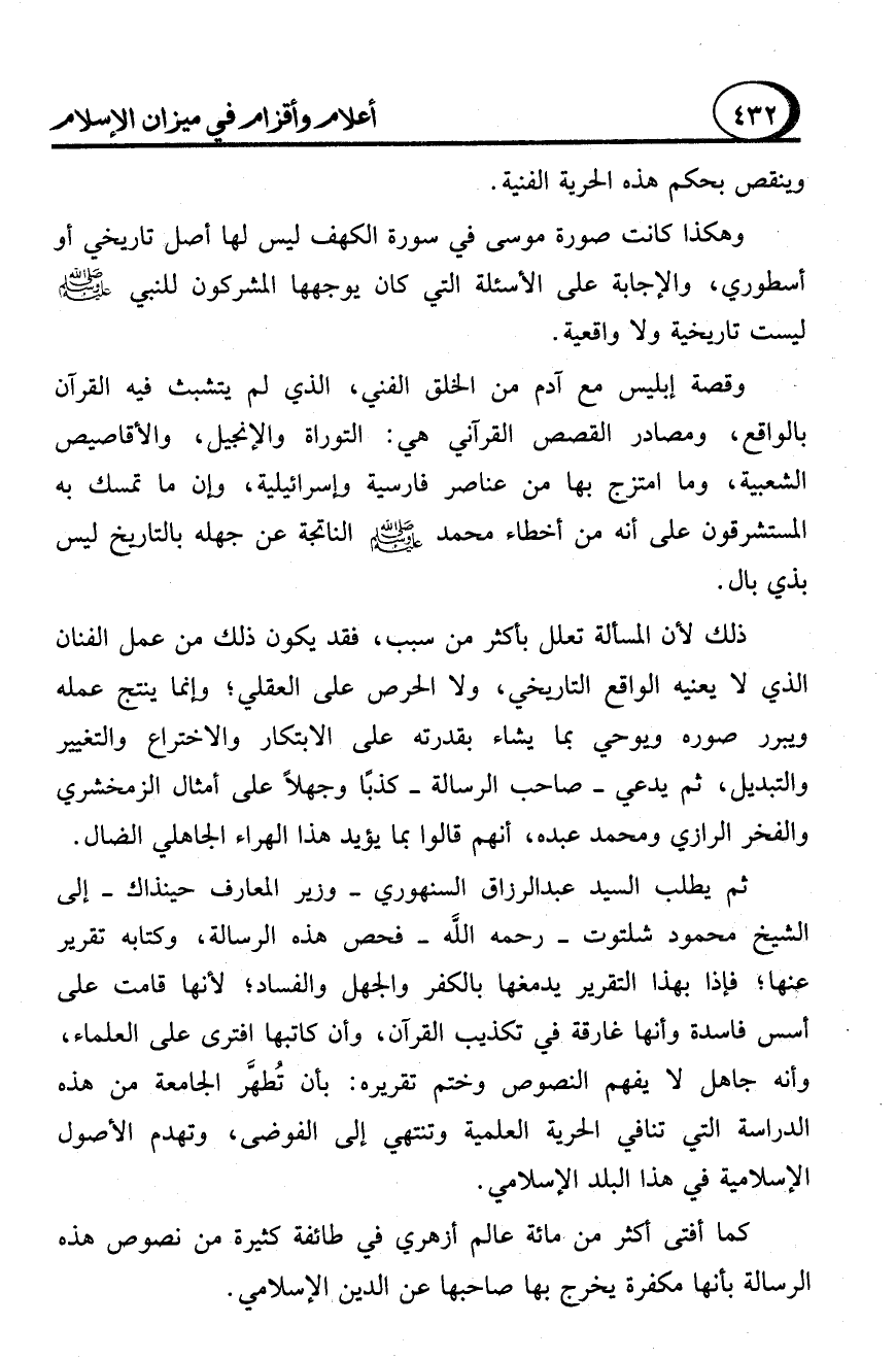 ذلك لأن المسألة تعلل بأكثر من سبب، فقد يكون ذلك من عمل الفنان الذي لا يعنيه الواقع التاريخي، ولا الحرص على العقلي؛ وإنما ينتج عمله ويبرر صوره ويوحي بما يشاء بقدرته على الابتكار والاختراع والتغيير والتبديل، ثم يدير -صاحب الرسالة- كذبًا وجهلاً على أمثال الزمخشري والفخر الرازي ومحمد عبده، أنهم قالوا بما يؤيد هذا الهراء الجاهلي الضال.