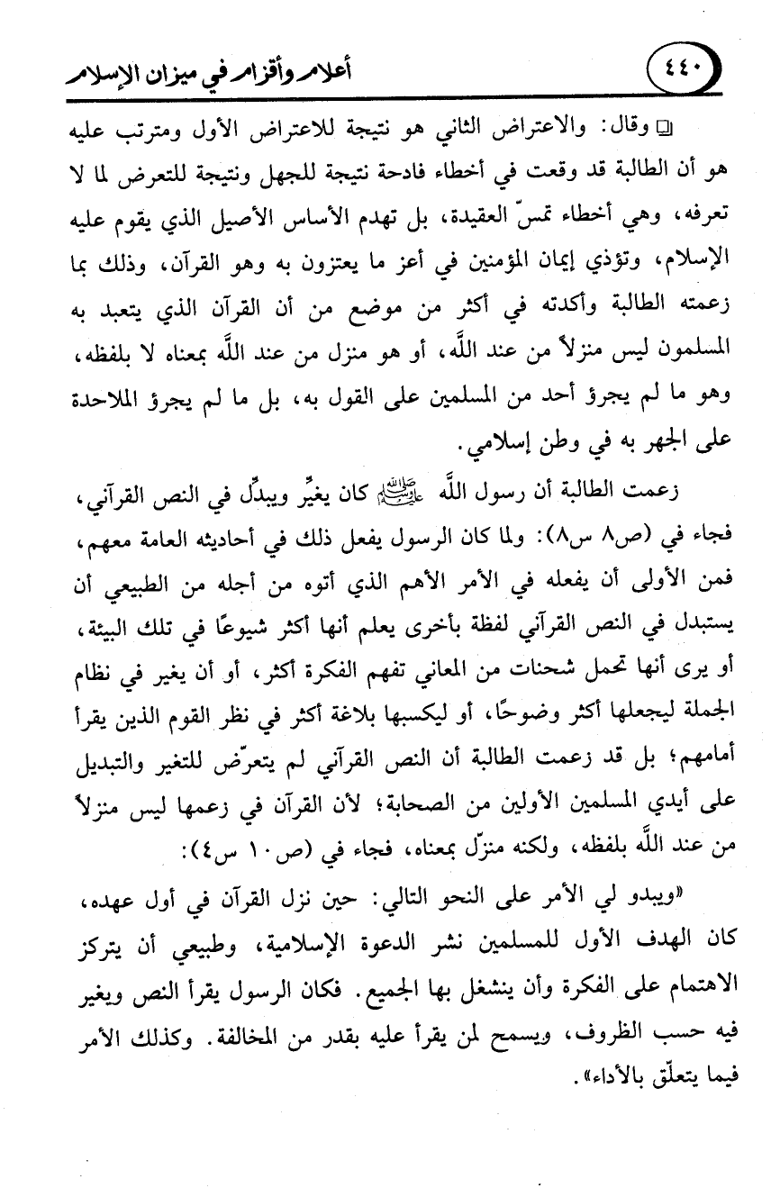 - وقال: والاعتراض الثاني هو نتيجة للاعتراض الأول ومترتب عليه هو أن الطالبة قد وقعت في أخطاء فادحة نتيجة للجهل ونتيجة للتعرض لما لا تعرفه، وهي أخطاء تمسّ العقيدة، بل تهدم الأساس الأصيل الذي يقوم عليه الإسلام، وتؤذي إيمان المؤمنين في أعز ما يعتزون به وهو القرآن، وذلك بما زعمته الطالبة وأكدته في أكثر من موضع من أن القرآن الذي يتعبد به المسلمون ليس منزلاً من عند الله، أو هو منزل من عند الله بمعناه لا بلفظه، وهو ما لم يجرؤ أحد من المسلمين على القول به، بل ما لم يجرؤ الملاحدة على الجهر به في وطن إسلامي.