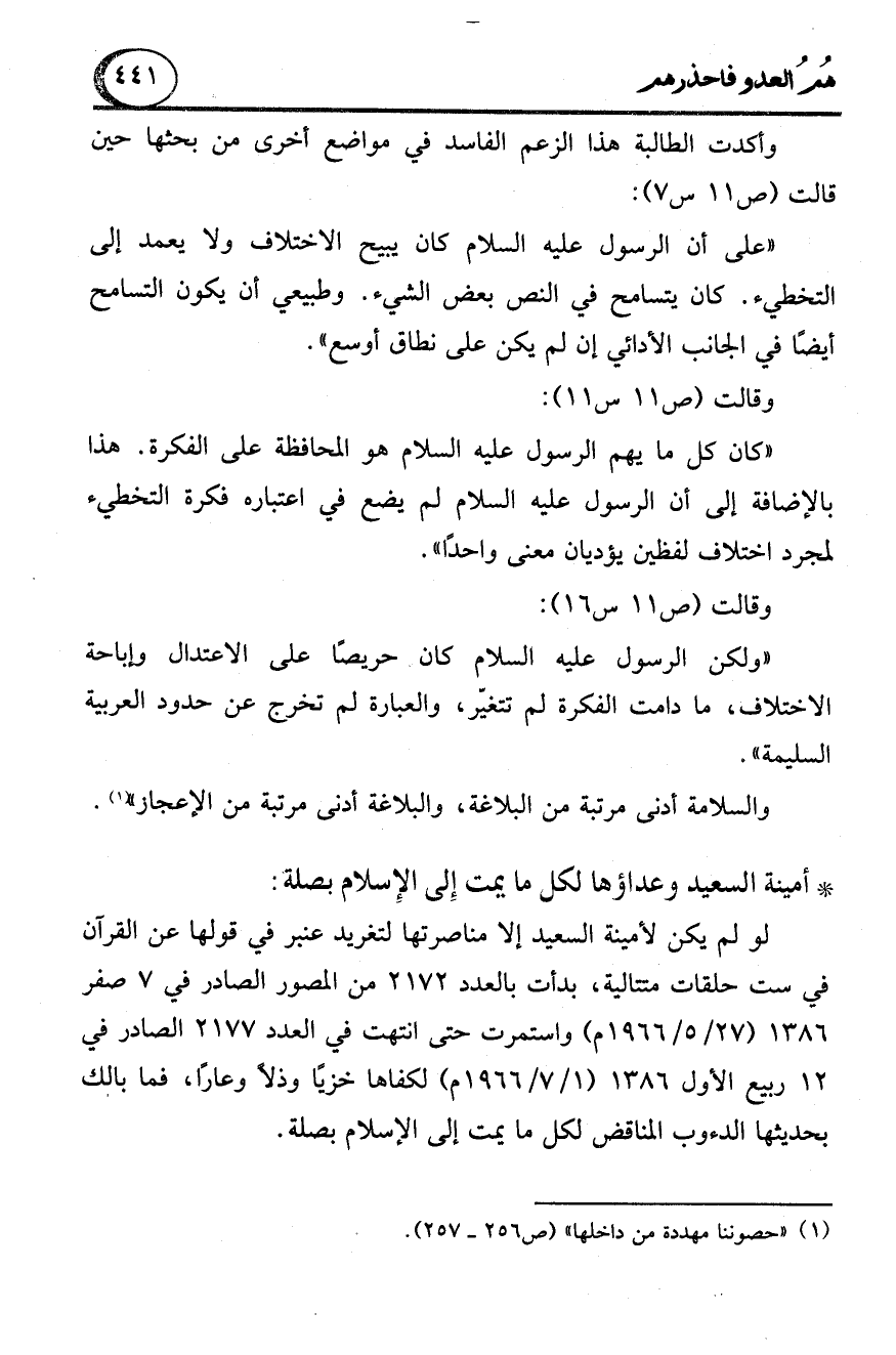 لو لم يكن لأمينة السعيد إلا مناصرتها لتغريد عنبر في قولها عن القرآن في ست حلقات متتالية، بدأت بالعدد 2172 من المصور الصادر في 7 صفر 1386 (27/ 5/1966 م) واستمرت حتى أنتهت في العدد 2177 الصادر في 12 ربيع الأول 1386 (1/ 7/1966 م) لكفاها خزيًا وذلاً وعارًا، فما بالك بحديثها الدءوب المناقض لكل ما يمت إلى الإسلام بصلة.
