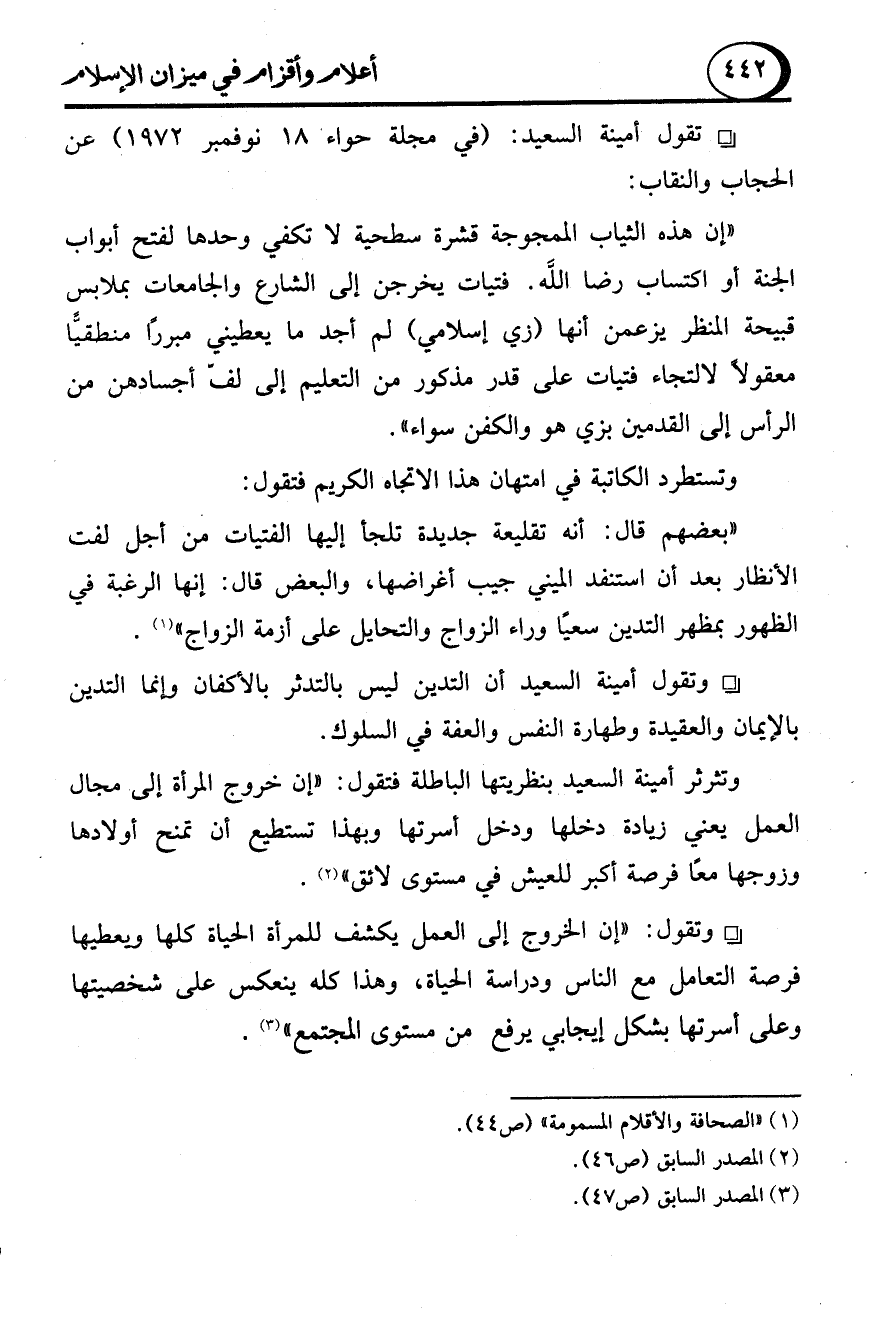 - تقول أمينة السعيد: (في مجلة حواء 18 نوفمبر 1972) عن الحجاب والنقاب: