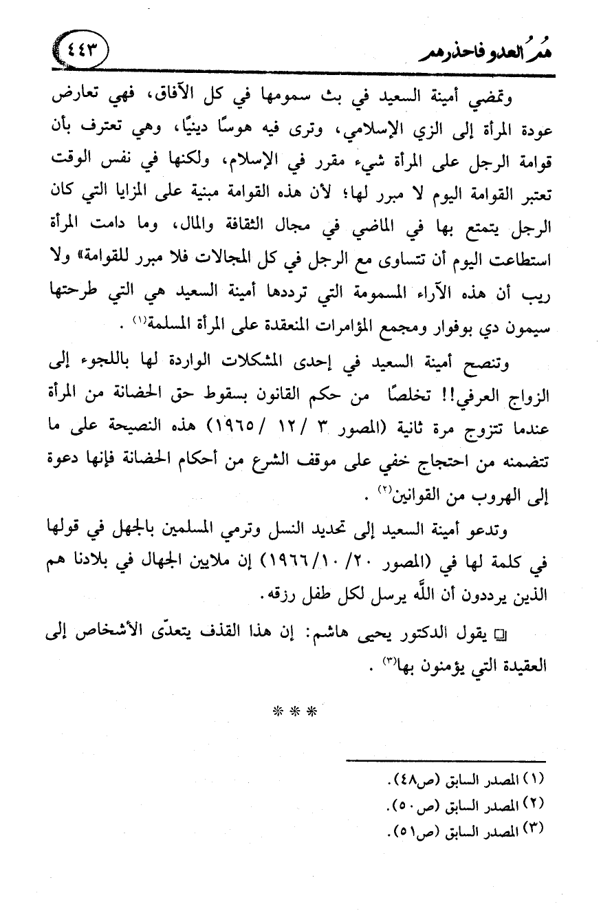 وتمضي أمينة السعيد في بث سمومها في كل الآفاق، فهي تعارض عودة المرأة إلى الزي الإسلامي، وترى فيه هوسًا دينيًا، وهي تعترف بأن قوامة الرجل على المرأة شيء مقرر في الإسلام، ولكنها في نفس الوقت تعتبر القوامة اليوم لا مبرر لها؛ لأن هذه القوامة مبنية على المزايا التي كان الرجل يتمتع بها في الماضي في مجال الثقافة والمال، وما دامت المرأة استطاعت اليوم أن تتساوى مع الرجل في كل المجالات فلا مبرر للقوامة" ولا ريب أن هذه الآراء المسمومة التي ترددها أمينة السعيد هي التي طرحتها سيمون دي بوفوار ومجمع المؤامرات المنعقدة على المرأة المسلمة (1).