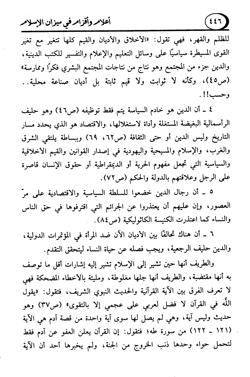 4 - أن الدين هو خادم السياسة يتم فقط توظيفه (ص 46) وهو حليف الرأسمالية البغيضة المستغلة وأداة لاستغلالها، والاقتصاد هو الذي يحدد مسار التاريخ وليس الدين أو حتى الثقافة (ص 62، 69) وببساطة يلتقي الشرق والغرب، والإسلام والمسيحية واليهودية في إصدار القوانين والقيم الأخلاقية والسياسية التي تجعل مفهوم الحرية أو الديمقراطية أو حقوق الإنسان قاصرة على الرجل وعلاقتهم بالدولة والحكم (ص 72).