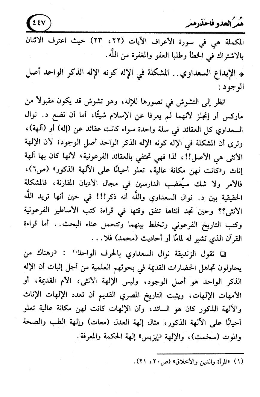 انظر إلى التشوش في تصورها للإله، وهو تشوش قد يكون مقبولاً من ماركس أو إنجلز لأنهما لم يعرفا عن الإسلام شيئًا، أما أن تضع د. نوال السعداوي كل العقائد في سلة واحدة سواء كانت عقائد عن (إله) أو (آلهة)، وترى أن المشكلة في الإله كونه الإله الذكر الواحد أصل الوجود؛ لأن الإلهة الأنثى هي الأصل!!، لذا فهي تحتفي بالعقائد الفرعونية؛ لأنها كان بها آلهة إناث و"كانت لهن مكانة عالية، تعلو أحيانا على الآلهة الذكور" (ص 6)، فالأمر ولا شك سيُغضب الدارسين في مجال الأديان المقارنة، فالمشكلة الحقيقية بين د. نوال السعداوي والله أنه ذكر!!! في حين أنها تريد الله الأنثى؟؟ وحين تجد أنثاها تنفق وقتها في قراءة كتب الأساطير الفرعونية وكتب التاريخ الفرعوني وتخلط بينهما وتتحمل عناء البحث .. أما قراءة القرآن الذي تشير له لمامًا أو أحاديث (محمد) فلا ...
