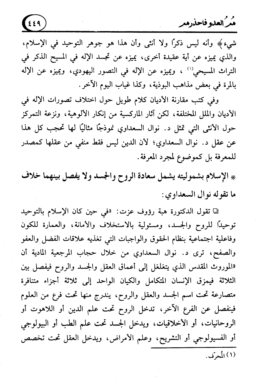 - تقول الدكتورة هبة رؤوف عزت: "في حين كان الإسلام بالتوحيد توحيدًا للروح والجسد، ومسئولية بالاستخلاف والأمانة، والعمارة للكون وفاعلية اجتماعية بنظام الحقوق والواجبات التي تغذيه علاقات الفضل والعفو والصفح، ترى د. نوال السعداوي من خلال حجاب المرجعية المادية أن "الموروث المقدس الذي يتغلغل إلى أعماق العقل والجسد والروح فيفصل بين الثلاثة فيمزق الإنسان المتكامل والكيان الواحد إلى ثلاثة أجزاء متنافرة متصارعة تحت اسم الجسد والعقل والروح، يندرج منها تحت فرع من العلوم فينفصل عن الفرع الآخر، تدخل الروح تحت علم الدين أو اللاهوت أو الروحانيات، أو الأخلاقيات، ويدخل الجسد تحت علم الطب أو البيولوجي أو الفسيولوجي أو التشريح، وعلم الأمراض، ويدخل العقل تحت تخصص