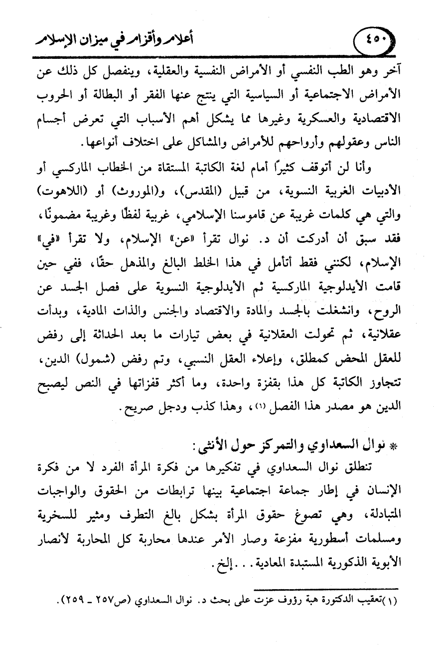 وأنا لن أتوقف كثيراً أمام لغة الكاتبة المستقاة من الخطاب الماركسي أو الأدبيات الغربية النسوية، من قبيل (المقدس)، و (الموروث) أو (اللاهوت) والتي هي كلمات غريبة عن قاموسنا الإسلامي، غربية لفظًا وغريبة مضمونًا، فقد سبق أن أدركت أن د. نوال تقرأ "عن" الإسلام، ولا تقرأ "في" الإسلام، لكنني فقط أتأمل في هذا الخلط البالغ والمذهل حقًا، ففي حين قامت الأيدلوجية الماركسية ثم الأيدلوجية النسوية على فصل الجسد عن الروح، وانشغلت بالجسد والمادة والاقتصاد والجنس والذات المادية، وبدأت عقلانية، ثم تحولت العقلانية في بعض تيارات ما بعد الحداثة إلى رفض للعقل المحض كمطلق، وإعلاء العقل النسبي، وتم رفض (شمول) الدين، تتجاوز الكاتبة كل هذا بقفزة واحدة، وما أكثر قفزاتها في النص ليصبح الدين هو مصدر هذا الفصل (1)، وهذا كذب ودجل صريح.