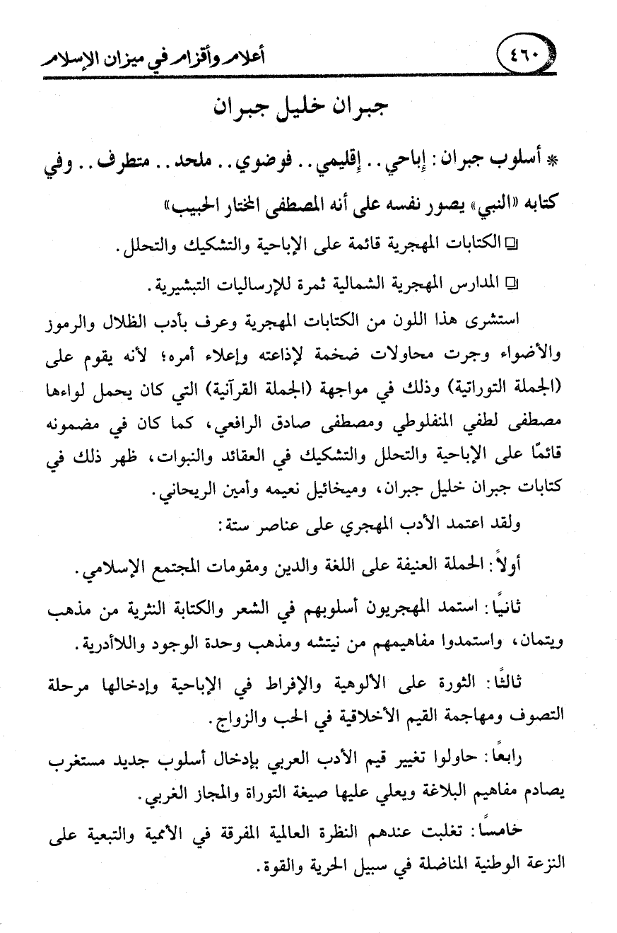 * أسلوب جبران: "إِباحي .. إقليمي .. فوضوي .. ملحد .. متطرف .. وفي كتابه "النبي" يصور نفسه على أنه المصطفى المختار الحبيب"