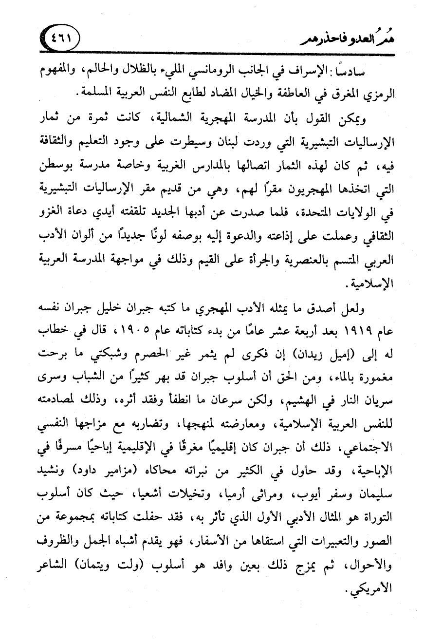 ولعل أصدق ما يمثله الأدب المهجري ما كتبه جبران خليل جبران نفسه عام 1919 بعد أربعة عشر عامًا من بدء كتاباته عام 1905، قال في خطاب له إلى (إميل زيدان) إن فكرى لم يثمر غير الحصرم وشبكتي ما برحت مغمورة بالماء، ومن الحق أن أسلوب جبران قد بهر كثيرًا من الشباب وسرى سريان النار في الهشيم، ولكن سرعان ما انطفأ وفقد أثره، وذلك لمصادمته للنفس العربية الإسلامية، ومعارضته لمنهجها، وتضاربه مع مزاجها النفسي الاجتماعي، ذلك أن جبران كان إقليميًا مغرقًا في الإقليمية إباحيًا مسرفًا في الإباحية، وقد حاول في الكثير من نبراته محاكاه (مزامير داود) ونشيد سليمان وسفر أيوب، ومراثى أرميا، وتخيلات أشعيا، حيث كان أسلوب التوراة هو المثال الأدبي الأول الذي تأثر به، فقد حفلت كتاباته بمجموعة من الصور والتعبيرات التي استقاها من الأسفار، فهو يقدم أشباه الجمل والظروف والأحوال، ثم يمزج ذلك بعين وافد هو أسلوب (ولت ويتمان) الشاعر الأمريكي.