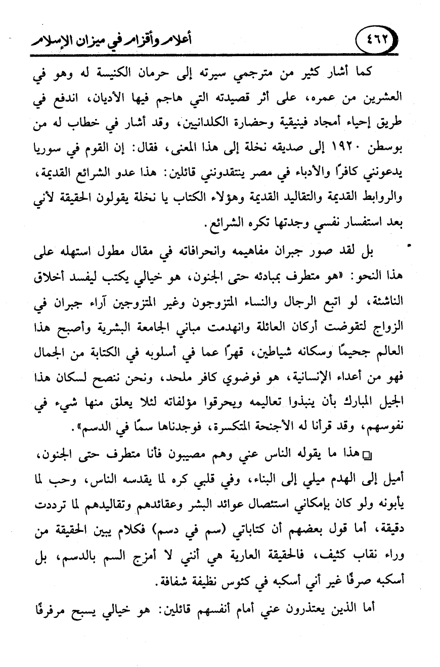 بل لقد صور جبران مفاهيمه وانحرافاته في مقال مطول استهله على هذا النحو: "هو متطرف بمبادئه حتى الجنون، هو خيالي يكتب ليفسد أخلاق الناشئة، لو اتبع الرجال والنساء المتزوجون وغير المتزوجين آراء جبران في الزواج لتقوضت أركان العائلة وانهدمت مباني الجامعة البشرية وأصبح هذا العالم جحيمًا وسكانه شياطين، قهرًا عما في أسلوبه في الكتابة من الجمال فهو من أعداء الإنسانية، هو فوضوي كافر ملحد، ونحن ننصح لسكان هذا الجيل المبارك بأن ينبذوا تعاليمه ويحرقوا مؤلفاته لئلا يعلق منها شيء في نفوسهم، وقد قرأنا له الأجنحة المتكسرة، فوجدناها سما في الدسم".