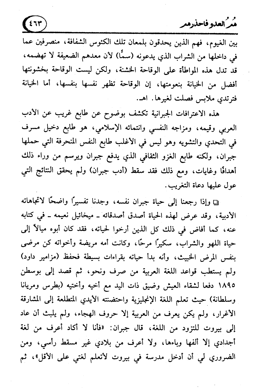 هذه الاعترافات الجبرانية تكشف بوضوح عن طابع غريب عن الأدب العربي وقيمه، ومزاجه النفسي وانتمائه الإسلامي، هو طابع دخيل مسرف في التحدي والتشويه وهو ليس في الأغلب طابع النفس المنحرفة التي حملها جبران، ولكنه طابع الغزو الثقافي الذي يدفع جبران ويرسم من وراء ذلك أهدافًا وغايات، ومع ذلك فقد سقط (أدب جبران) ولم يحقق النتائج التي عول عليها دعاة التغريب.