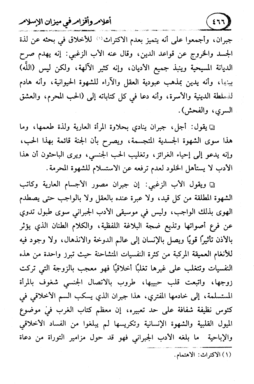 جبران، وأجمعوا على أنه يتميز بعدم الاكتراث (1) للأخلاق في بحثه عن لذة الجسد والخروج عن قواعد الدين، وقال عنه الأب الزغبي: إنه يهدم صرح الديانة المسيحية وينبذ جميع الأديان، وإنه كثير الآلهة، ولكن ليس (الله) بينها، وأنه يدين بمذهب عبودية العقل والآراء للشهوة الحيوانية، وأنه هادم للسلطة الدينية والأسرة، وأنه دعا في كل كتاباته إلى (الحب المحرم، والعشق السري، والفحش).