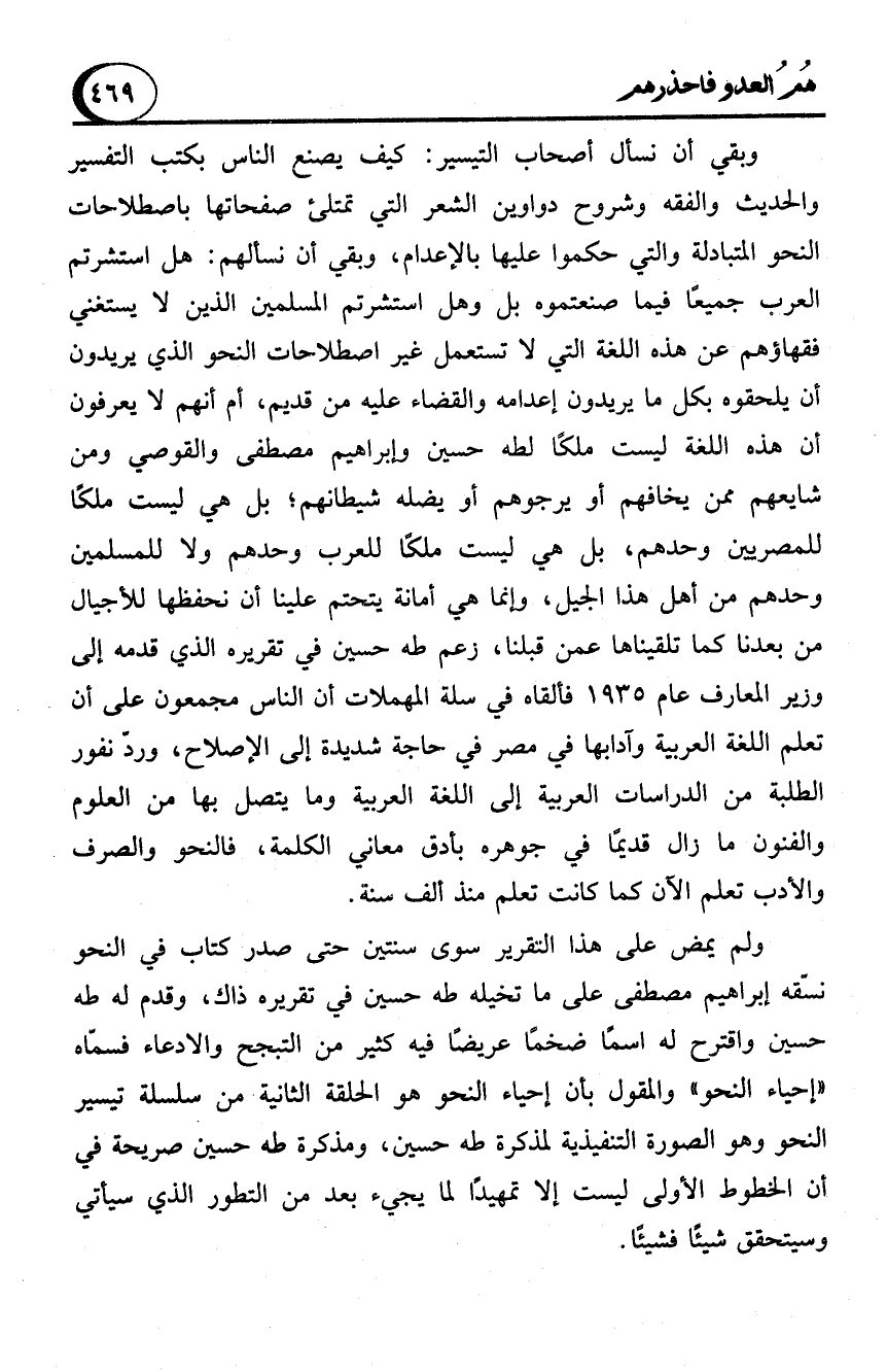 وبقي أن نسأل أصحاب التيسير: كيف يصنع الناس بكتب التفسير والحديث والفقه وشروح دواوين الشعر التي تمتلئ صفحاتها باصطلاحات النحو المتبادلة والتي حكموا عليها بالإعدام، وبقي أن نسألهم: هل استشرتم العرب جميعًا فيما صنعتموه بل وهل استشرتم المسلمين الذين لا يستغني فقهاؤهم عن هذه اللغة التي لا تستعمل غير اصطلاحات النحو الذي يريدون أن يلحقوه بكل ما يريدون إعدامه والقضاء عليه من قديم، أم أنهم لا يعرفون أن هذه اللغة ليست ملكًا لطه حسين وإبراهيم مصطفى والقوصي ومن شايعهم ممن يخافهم أو يرجوهم أو يضله شيطانهم؛ بل هي ليست ملكًا للمصريين وحدهم، بل هي ليست ملكًا للعرب وحدهم ولا للمسلمين وحدهم من أهل هذا الجيل، وإنما هي أمانة يتحتم علينا أن نحفظها للأجيال من بعدنا كما تلقيناها عمن قبلنا، زعم طه حسين في تقريره الذي قدمه إلى وزير المعارف عام 1935 فألقاه في سلة المهملات أن الناس مجمعون على أن تعلم اللغة العربية وآدابها في مصر في حاجة شديدة إلى الإصلاح، ورد نفور الطلبة من الدراسات العربية إلى اللغة العربية وما يتصل بها من العلوم والفنون ما زال قديمًا في جوهره بأدق معاني الكلمة، فالنحو والصرف والأدب تعلم الآن كما كانت تعلم منذ ألف سنة.