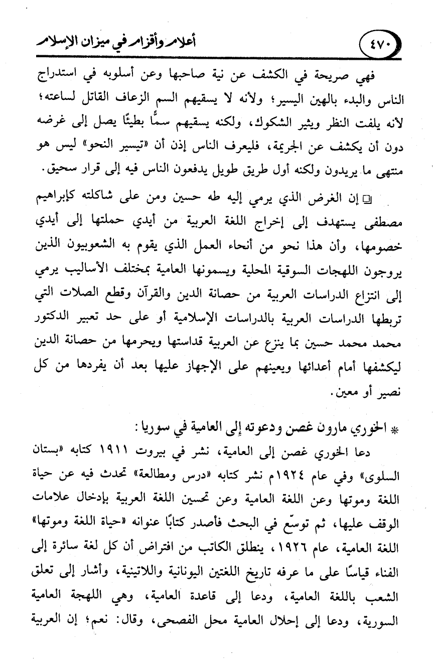 - إن الغرض الذي يرمي إليه طه حسين ومن على شاكلته كإبراهيم مصطفى يستهدف إلى إخراج اللغة العربية من أيدي حملتها إلى أيدي خصومها، وأن هذا نحو من أنحاء العمل الذي يقوم به الشعوبيون الذين يروجون اللهجات السوقية المحلية ويسمونها العامية بمختلف الأساليب يرمي إلى أنتزاع الدراسات العربية من حصانة الدين والقرآن وقطع الصلات التي تربطها الدراسات العربية بالدراسات الإسلامية أو على حد تعبير الدكتور محمد محمد حسين بما ينزع عن العربية قداستها ويحرمها من حصانة الدين ليكشفها أمام أعدائها ويعينهم على الإجهاز عليها بعد أن يفردها من كل نصير أو معين.