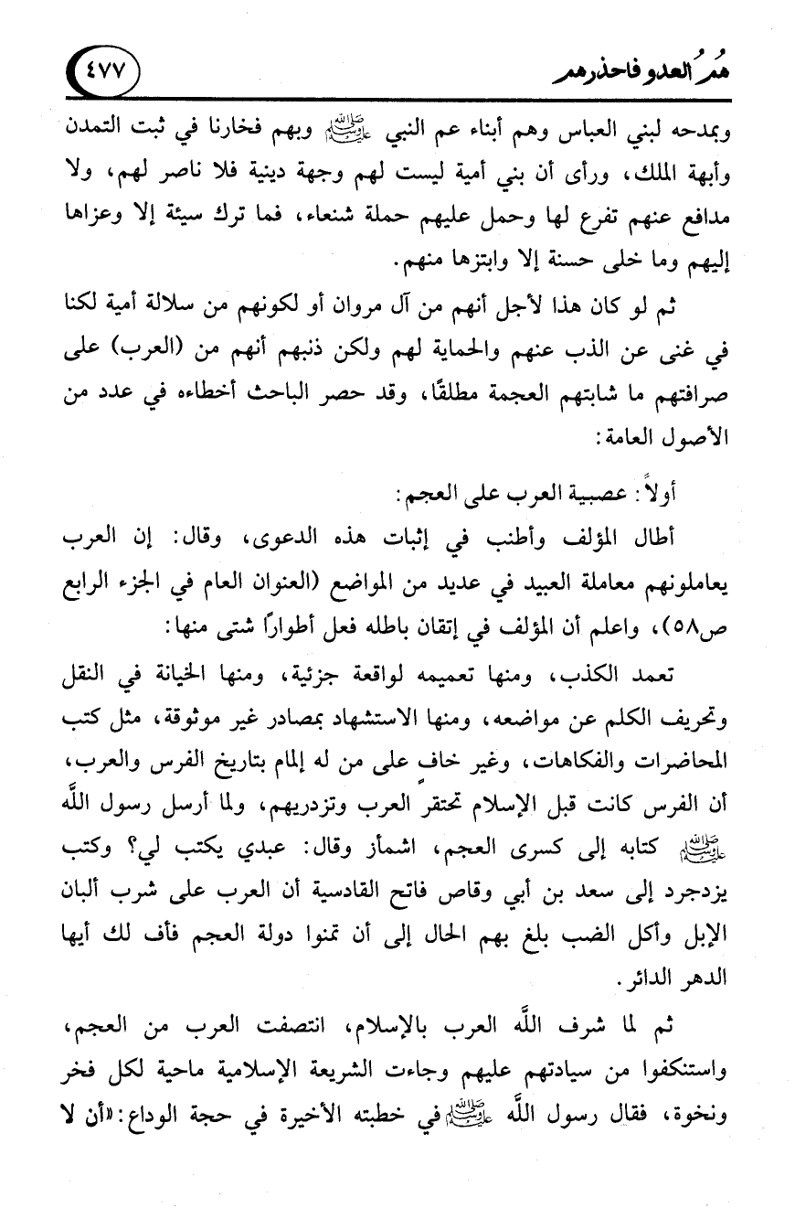 ثم لو كان هذا لأجل أنهم من آل مروان أو لكونهم من سلالة أمية لكنا في غنى عن الذب عنهم والحماية لهم ولكن ذنبهم أنهم من (العرب) على صرافتهم ما شابتهم العجمة مطلقًا، وقد حصر الباحث أخطاءه في عدد من الأصول العامة: