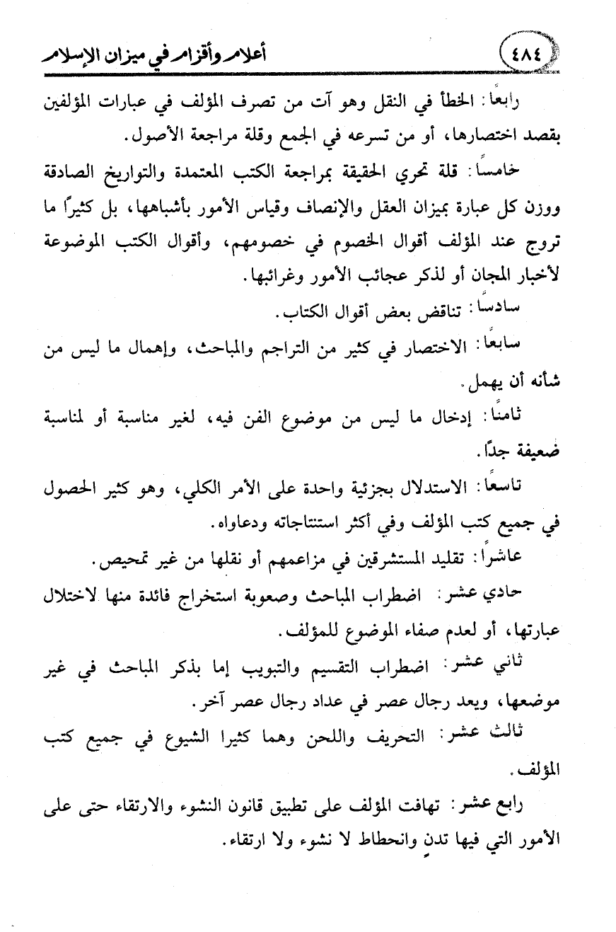 خامسًا: قلة تحري الحقيقة بمراجعة الكتب المعتمدة والتواريخ الصادقة ووزن كل عبارة بميزان العقل والإنصاف وقياس الأمور بأشباهها، بل كثيرًا ما تروج عند المؤلف أقوال الخصوم في خصومهم، وأقوال الكتب الموضوعة لأخبار المجان أو لذكر عجائب الأمور وغرائبها.
