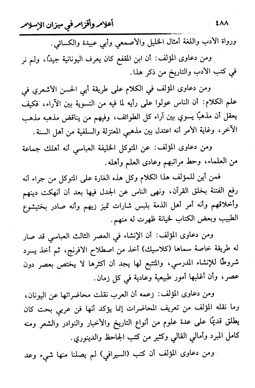 ومن دعاوى المؤلف: أن ابن المقفع كان يعرف اليونانية جيدًا، ولم نر في كتب الأدب والتاريخ من ذكر هذا.