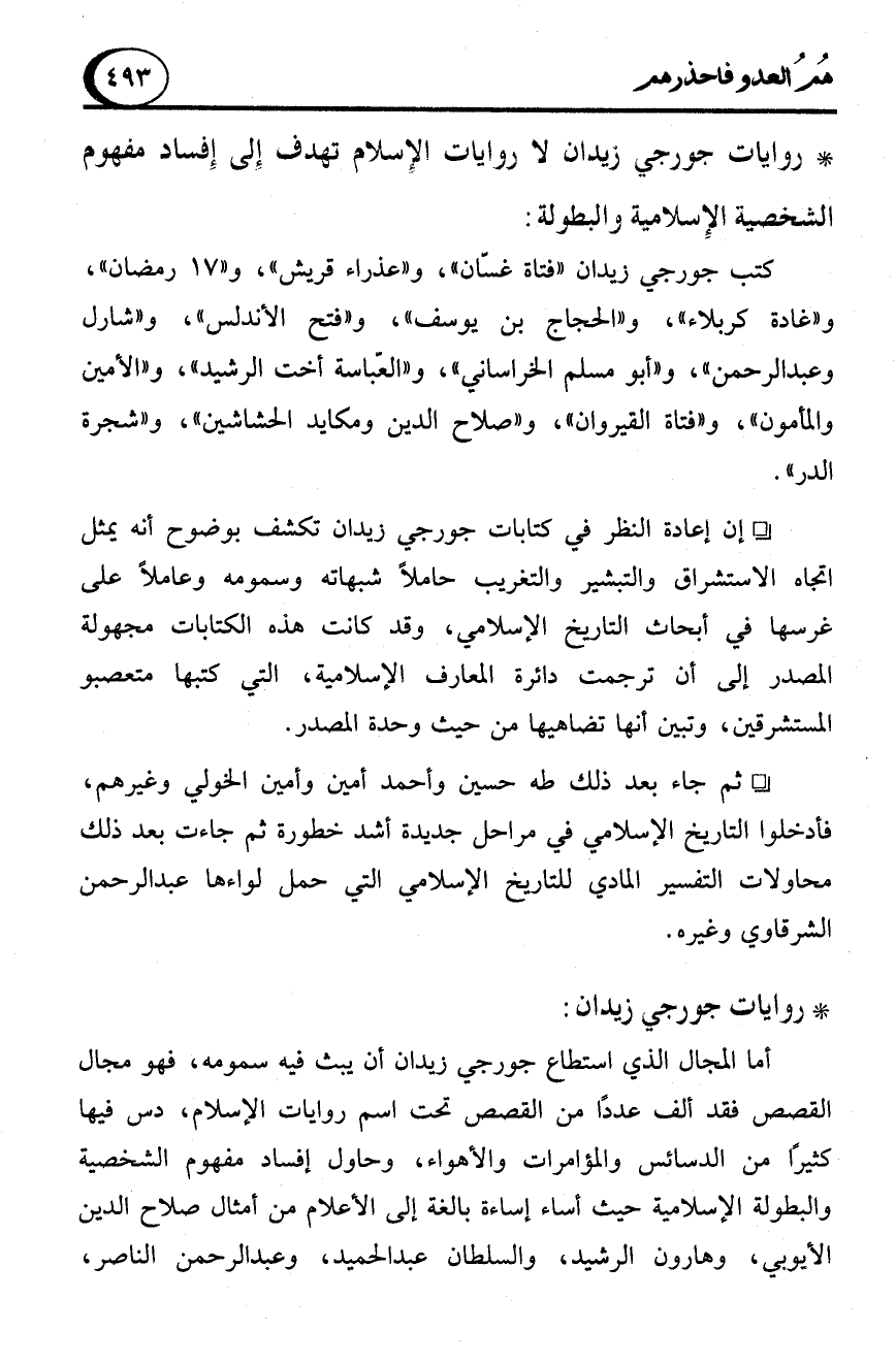 - إن إعادة النظر في كتابات جورجي زيدان تكشف بوضوح أنه يمثل اتجاه الاستشراق والتبشير والتغريب حاملاً شبهاته وسمومه وعاملاً على غرسها في أبحاث التاريخ الإسلامي، وقد كانت هذه الكتابات مجهولة المصدر إلى أن ترجمت دائرة المعارف الإسلامية، التي كتبها متعصبو المستشرقين، وتبين أنها تضاهيها من حيث وحدة المصدر.
