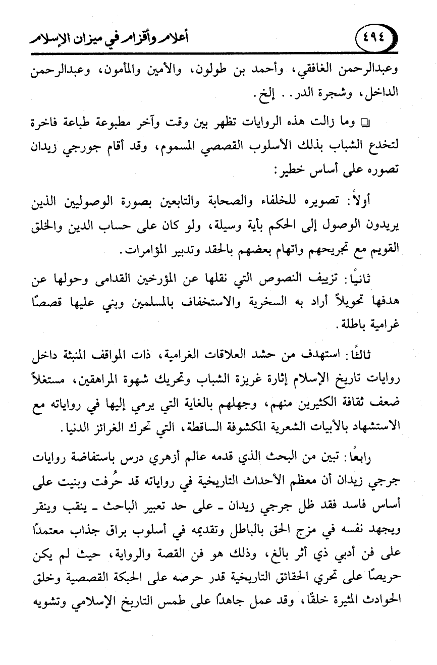 - وما زالت هذه الروايات تظهر بين وقت وآخر مطبوعة طباعة فاخرة لتخدع الشباب بذلك الأسلوب القصصي المسموم، وقد أقام جورجي زيدان تصوره على أساس خطير: