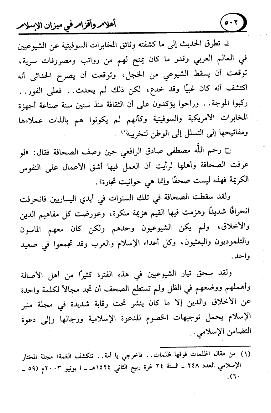 (1) من مقال "ظلمات فوقها ظلمات .. فاخرجي يا أمة .. تنكشف الغمة" مجلة المختار الإسلامي العدد 248 - السنة 24 غرة ربيع الثاني 1424 هـ- 1 يونيو 2003 م (59 - 60).