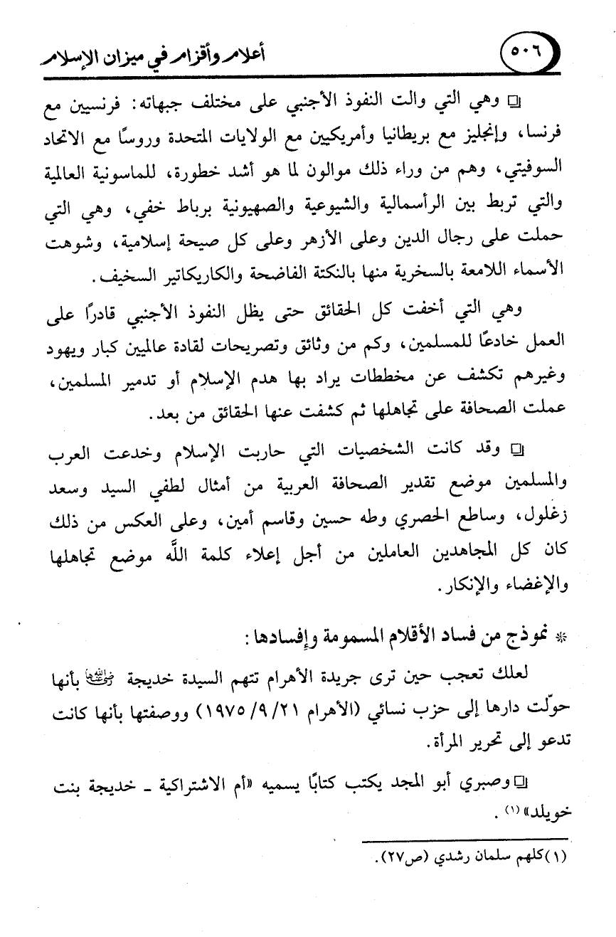 - وقد كانت الشخصيات التي حاربت الإسلام وخدعت العرب والمسلمين موضع تقدير الصحافة العربية من أمثال لطفي السيد وسعد زغلول، وساطع الحصري وطه حسين وقاسم أمين، وعلى العكس من ذلك كان كل المجاهدين العاملين من أجل إعلاء كلمة الله موضع تجاهلها والإغضاء والإنكار.