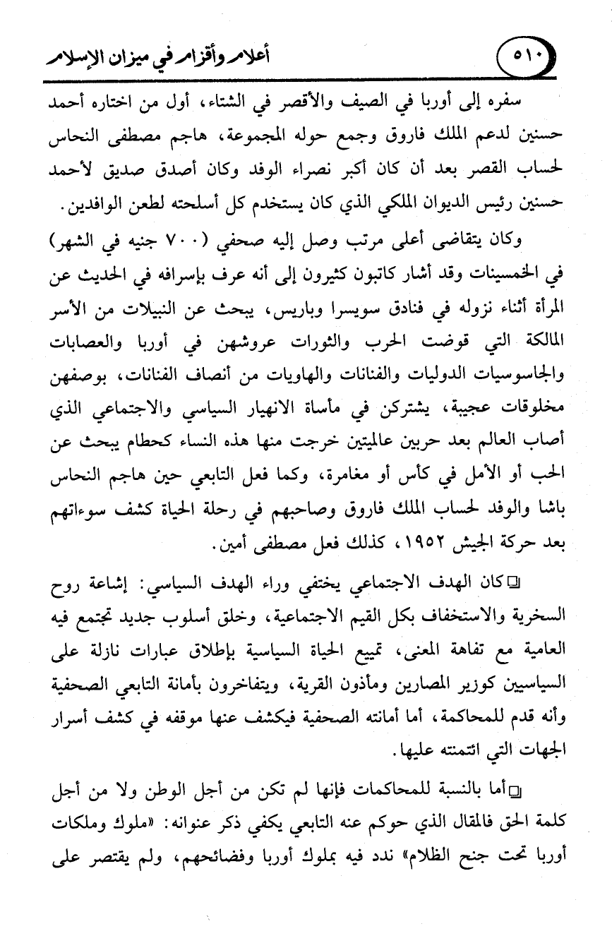 - أما بالنسبة للمحاكمات فإنها لم تكن من أجل الوطن ولا من أجل كلمة الحق فالمقال الذي حوكم عنه التابعي يكفي ذكر عنوانه: "ملوك وملكات أوربا تحت جنح الظلام" ندد فيه بملوك أوربا وفضائحهم، ولم يقتصر على