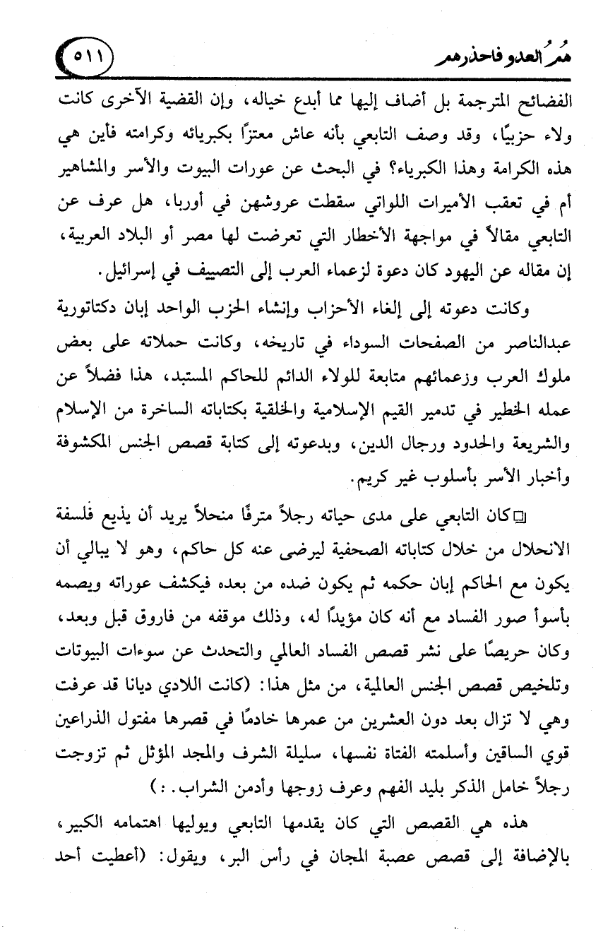الفضائح المترجمة بل أضاف إليها مما أبدع خياله، وإن القضية الآخرى كانت ولاء حزبيًا، وقد وصف التابعي بأنه عاش معتزًا بكبريائه وكرامته فأين هي هذه الكرامة وهذا الكبرياء؟ في البحث عن عورات البيوت والأسر والمشاهير أم في تعقب الأميرات اللواتي سقطت عروشهن في أوربا، هل عرف عن التابعي مقالاً في مواجهة الأخطار التي تعرضت لها مصر أو البلاد العربيهّ، إن مقاله عن اليهود كان دعوة لزعماء العرب إلى التصييف في إسرائيل.