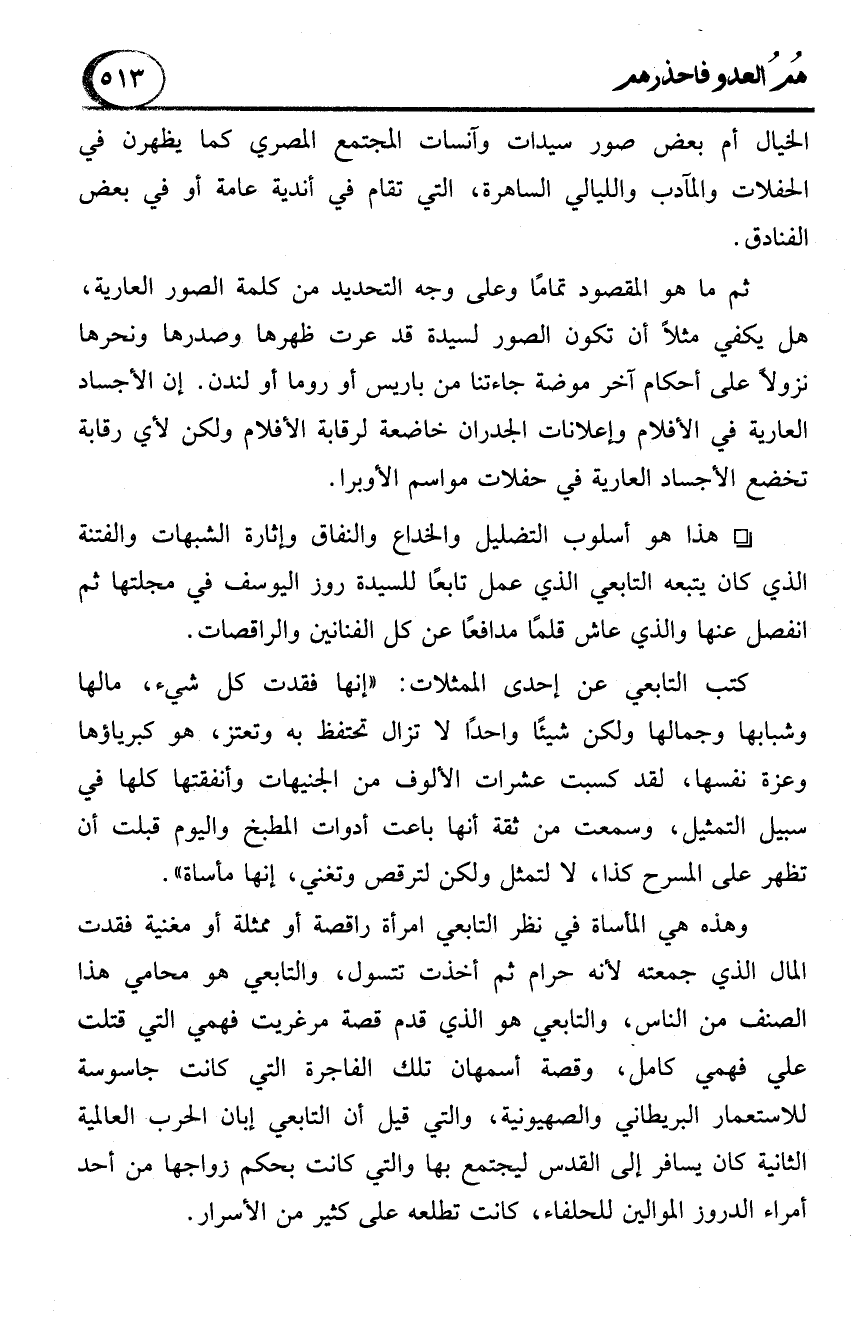ثم ما هو المقصود تمامًا وعلى وجه التحديد من كلمة الصور العارية، هل يكفي مثلا أن تكون الصور لسيدة قد عرت ظهرها وصدرها ونحرها ْنزولا على أحكام آخر موضة جاءتنا من باريس أو روما أو لندن. إن الأجساد العارية في الأفلام وإعلانات الجدران خاضعة لرقابة الأفلام ولكن لأي رقابة تخضع الأجساد العارية في حفلات مواسم الأوبرا.