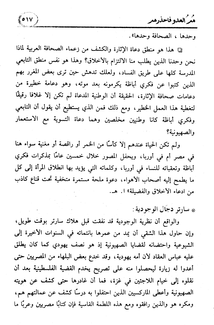 والواقع أن نظرية الوجودية قد نفقت قبل هلاك سارتر بوقت طويل، وإن حاول هذا الشقي أن يمد من عمرها بانتمائه في السنوات الأخيرة إلى الشيوعية واحتضانه لقضايا الصهيونية إذ هو نصف يهودي كما كان يطلق عليه عباس العقاد لأن أمه يهودية، وقد خدع بعض البلهاء من المصريين حتى أعدوا له زيارة ليحصلوا منه على تصريح يخدم القضية الفلسطينية بعد أن نقلوه إلى خيام اللاجئين في غزة، فما أن غادرها حتى كشف عن هويته الصهيونية وأعطى الماركسيين الذين احتفلوا به درسًا كشف عن عمالتهم هم، ومكره هو والذين رافقوه ومع هذه اللطمة القاسية فإن كتابًا مصريين وعربًا ما