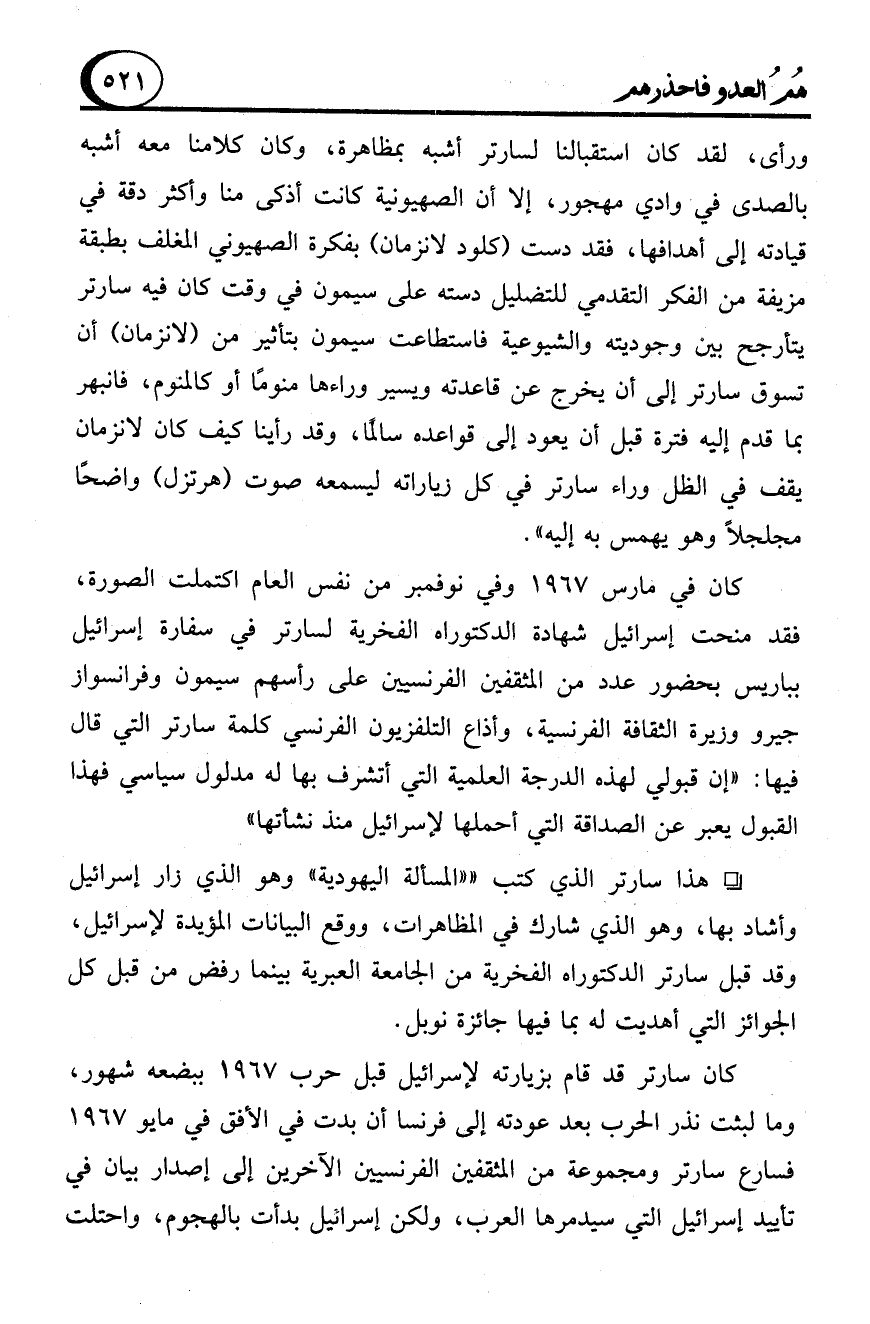 - هذا سارتر الذي كتب "المسألة اليهودية" وهو الذي زار إسرائيل وأشاد بها، وهو الذي شارك في المظاهرات، ووقع البيانات المؤيدة لإسرائيل، وقد قبل سارتر الدكتوراه الفخرية من الجامعة العبرية بينما رفض من قبل كل الجوائز التي أهديت له بما فيها جائزة نوبل.