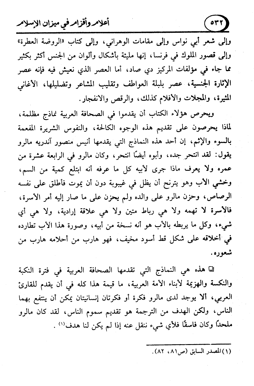 - هذه هي النماذج التي تقدمها الصحافة العربية في فترة النكبة والنكسة والهزيمة لأبناء الأمة العربية، ما قيمة هذا كله في أن يقدم للقارئ العربي، ألا يوجد لدى مالرو فكرة أو فكرتان إنسانيتان يمكن أن ينتفع بهما الناس، ولكن الهدف من الترجمة هو تقديم سموم الناس، لقد كان مالرو ملحدًا وكان فاسقًا فلأي شيء ننقل عنه إذا لم يكن لنا هدف (1).