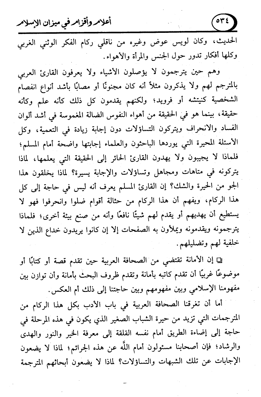 أما أن تغرقنا الصحافة العربية في باب الأدب بكل هذا الركام من المترجمات التي تزيد من حيرة الشباب الصغير الذي يكون في هذه المرحلة في حاجة إلى إضاءة الطريق أمام نفسه القلقة إلى معرفة الخير والنور والهدى والرشاد؛ فإن أصحابنا مسئولون أمام الله عن هذه الجرائم؛ لماذا لا يضعون الإجابات عن تلك الشبهات والتساؤلات؟ لماذا لا يضعون أبحاثهم المترجمة