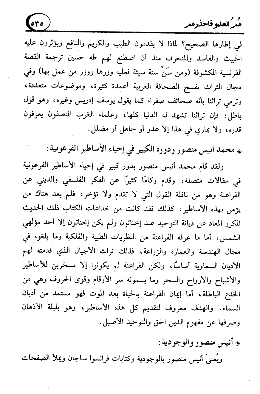 ولقد قام محمد أنيس منصور بدور كبير في إحياء الأساطير الفرعونية في مقالات متصلة، وقدم ركامًا كثيرًا عن الفكر الفلسفي والديني عن الفراعنة وهو من نافلة القول التي لا تقدم ولا تؤخر، فلم يعد هناك من يؤمن بهذه الأساطير، كذلك فقد كانت من خداعات الكتاب ذلك الحديث المكرر المعاد عن ديانة التوحيد عند إخناتون ولم يكن إخناتون إلا أحد مؤلهي الشمس، أما ما عرفه الفراعنة من النظريات الطبية والفلكية وما بلغوه في مجال الهندسة والعمارة والزراعة، فذلك تراث الأجيال الذي قدمته لهم الأديان السماوية أساسًا، ولكن الفراعنة لم يكونوا إلا مسخرين للأساطير والأشباح والأرواح والسحر وما يسمونه سر الأرقام وقوى الحروف وهي من الخدع الباطلة، أما إيمان الفراعنة بالحياة بعد الموت فهو مستمد من أديان السماء، والهدف معروف لتقديم كل هذه الأساطير، وهو بلبلة الأذهان وصرفها عن مفهوم الدين الحق والتوحيد الأصيل.