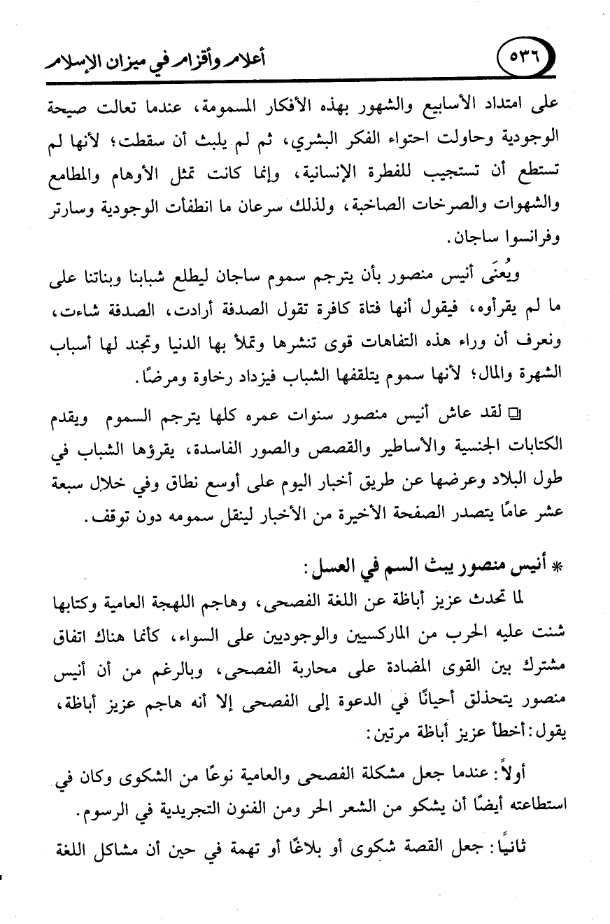 ويُعنَى أنيس منصور بأن يترجم سموم ساجان ليطلع شبابنا وبناتنا على ما لم يقرأوه، فيقول أنها فتاة كافرة تقول الصدفة أرادت، الصدفة شاءت، ونعرف أن وراء هذه التفاهات قوى تنشرها وتملأ بها الدنيا وتجند لها أسباب الشهرة والمال؛ لأنها سموم يتلقفها الشباب فيزداد رخاوة ومرضًا.