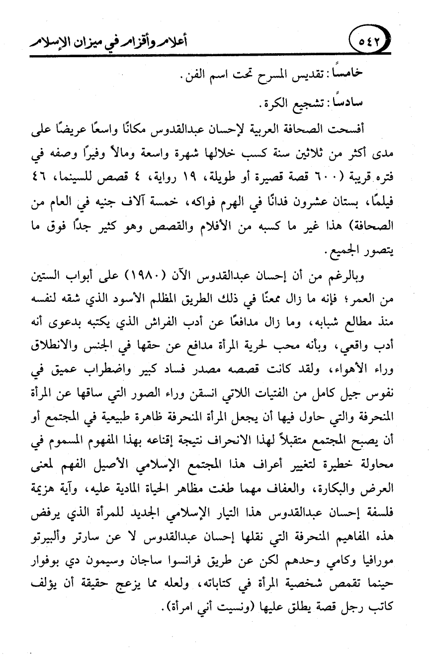 وبالرغم من أن إحسان عبد القدوس الآن (1980) على أبواب الستين من العمر؛ فإنه ما زال ممعنًا في ذلك الطريق المظلم الأسود الذي شقه لنفسه منذ مطالع شبابه، وما زال مدافعًا عن أدب الفراش الذي يكتبه بدعوى أنه أدب واقعي، وبأنه محب لحرية المرأة مدافع عن حقها في الجنس والانطلاق وراء الأهواء، ولقد كانت قصصه مصدر فساد كبير واضطراب عميق في نفوس جيل كامل من الفتيات اللاتي انسقن وراء الصور التي ساقها عن المرأة المنحرفة والتي حاول فيها أن يجعل المرأة المنحرفة ظاهرة طبيعية في المجتمع أو أن يصبح المجتمع متقبلاً لهذا الانحراف نتيجة إقناعه بهذا المفهوم المسموم في محاولة خطيرة لتغيير أعراف هذا المجتمع الإسلامي الأصيل الفهم لمعنى العرض والبكارة، والعفاف مهما طغت مظاهر الحياة المادية عليه، وآية هزيمة فلسفة إحسان عبد القدوس هذا التيار الإسلامي الجديد للمرأة الذي يرفض هذه المفاهيم المنحرفة التي نقلها إحسان عبد القدوس لا عن سارتر وألبيرتو مورافيا وكامي وحدهم لكن عن طريق فرانسوا ساجان وسيمون دي بوفوار حينما تقمص شخصية المرأة في كتاباته، ولعله مما يزعج حقيقة أن يؤلف كاتب رجل قصة يطلق عليها (ونسيت أني امرأة).