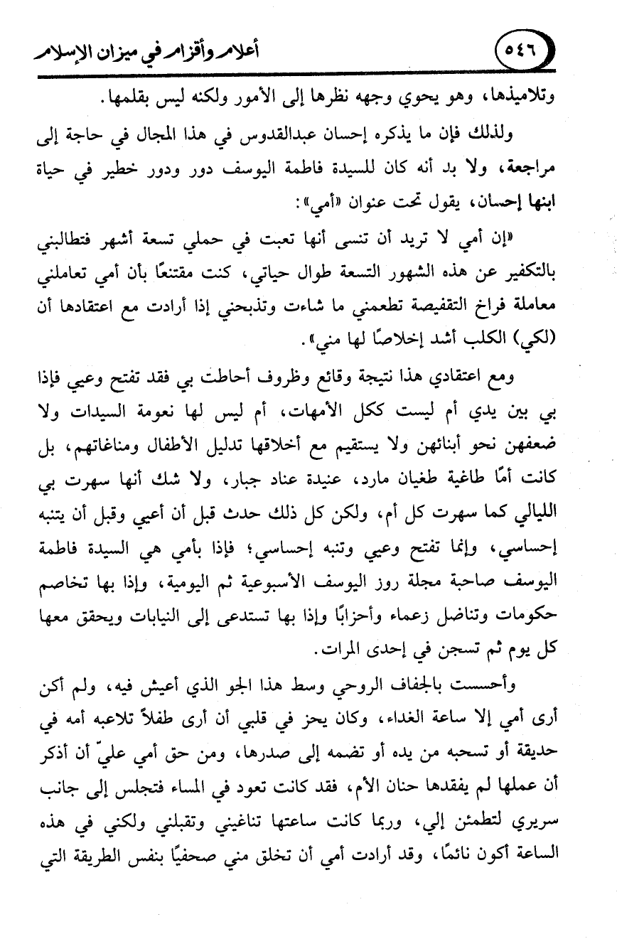 ولذلك فإن ما يذكره إحسان عبد القدوس في هذا المجال في حاجة إلى مراجعة، ولا بد أنه كان للسيدة فاطمة اليوسف دور ودور خطير في حياة ابنها إحسان، يقول تحت عنوان "أمي":