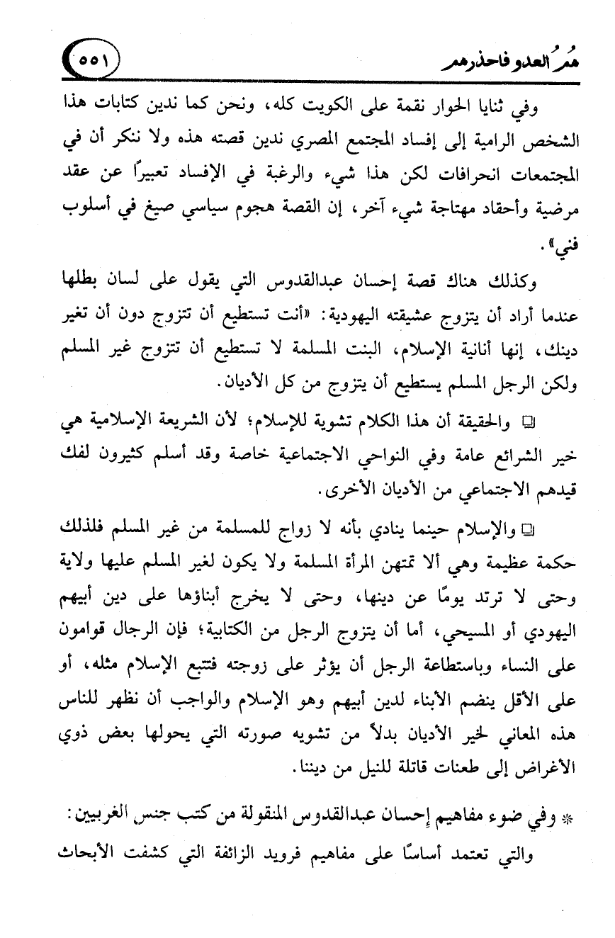 وكذلك هناك قصة إحسان عبد القدوس التي يقول على لسان بطلها عندما أراد أن يتزوج عشيقته اليهودية: "أنت تستطيع أن تتزوج دون أن تغير دينك، إنها أنانية الإسلام، البنت المسلمة لا تستطيع أن تتزوج غير المسلم ولكن الرجل المسلم يستطيع أن يتزوج من كل الأديان.