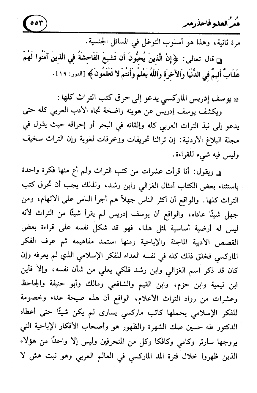 - ويقول: أنا قرأت عشرات من كتب التراث ولم أع منها فكرة واحدة باستثناء بعض الكتاب أمثال الغزالي وابن رشد، ولذلك يجب أن تحرق كتب التراث كلها. والواقع أن أكثر الناس جهلاً هم أجرأ الناس على الاتهام، ومن جهل شيئًا عاداه، والواقع أن يوسف إدريس لم يقرأ شيئًا من التراث لأنه ليس له أرضية أساسية لمثل هذا، فهو قد شكل نفسه على قراءة بعض القصص الأدبية الماجنة والإباحية ومنها استمد مفاهيمه ثم عرف الفكر الماركسي فخلق ذلك كله في نفسه العداء للفكر الإسلامي الذي لم يعرفه وإن كان قد ذكر اسم الغزالي وابن رشد فلكي يعلي من شأن نفسه، وإلا فأين ابن تيمية وابن حزم، وابن القيم والشافعي ومالك وأبو حنيفة والجاحظ وعشرات من رواد التراث الأعلام، الواقع أن هذه صيحة عداء وخصومة للفكر الإسلامي يحملها كاتب ماركسي يسارى لم يكن شيئًا حتى أعطاه الدكتور طه حسين صك الشهرة والظهور هو وأصحاب الأفكار الإباحية التي يروجها سارتر وكامي وكافكا وكل من المنحرفين وليس إلا واحدًا من هؤلاء الذين ظهروا خلال فترة المد الماركسي في العالم العربي وهو نبت هش لا