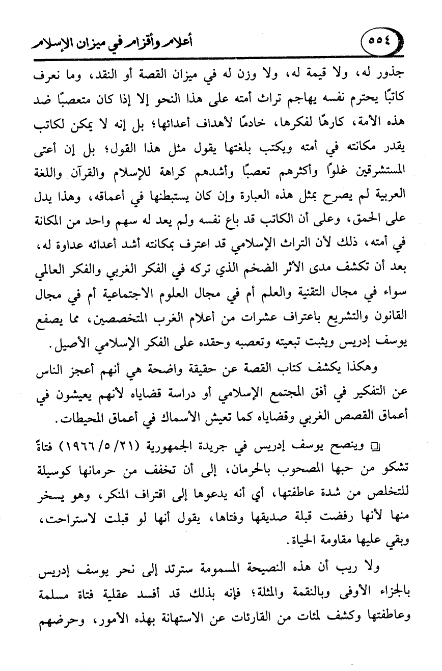 جذور له، ولا قيمة له، ولا وزن له في ميزان القصة أو النقد، وما نعرف كاتبًا يحترم نفسه يهاجم تراث أمته على هذا النحو إلا إذا كان متعصبًا ضد هذه الأمة، كارهًا لفكرها، خادمًا لأهداف أعدائها؛ بل إنه لا يمكن لكاتب يقدر مكانته في أمته ويكتب بلغتها يقول مثل هذا القول؛ بل إن أعتى المستشرقين غلوًا وأكثرهم تعصبًا وأشدهم كراهة للإسلام والقرآن واللغة العربية لم يصرح بمثل هذه العبارة وإن كان يستبطنها في أعماقه، وهذا يدل على الحمق، وعلى أن الكاتب قد باع نفسه ولم يعد له سهم واحد من المكانة في أمته، ذلك لأن التراث الإسلامي قد اعترف بمكانته أشد أعدائه عداوة له، بعد أن تكشف مدى الأثر الضخم الذي تركه في الفكر الغربي والفكر العالمي سواء في مجال التقنية والعلم أم في مجال العلوم الاجتماعية أم في مجال القانون والتشريع باعتراف عشرات من أعلام الغرب المتخصصين، مما يصفع يوسف إدريس ويثبت تبعيته وتعصبه وحقده على الفكر الإسلامي الأصيل.