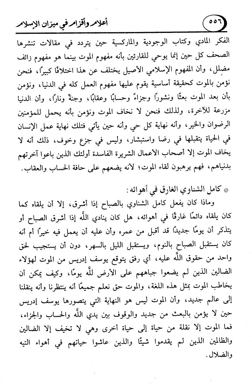 الفكر المادي وكتاب الوجودية والماركسية حين يتردد في مقالات تنشرها الصحف كل حين إنما يوحي للقارئين بأنه مفهوم الموت بينما هو مفهوم زائف مضلل، وأن المفهوم الإسلامي الأصيل يختلف عن هذا اختلافًا كبيرًا، فنحن نؤمن بالموت كحقيقة أساسية يقوم عليها مفهوم العمل كله في الدنيا، ونؤمن بأن بعد الموت بعثًا ونشورًا وجزاءً وحسابًا وعقابًا، وجنةً ونارًا، وأن الدنيا مزرعة للآخرة، ولذلك فنحن لا نخاف الموت ونؤمن بأنه يحمل للمؤمنين الرضوان والخير، وأنه نهاية كل حي وأنه حين يأتي فتلك نهاية عمل الإنسان في الحياة يتقبلها في رضا واستبشار، وليس في جزع وخوف، ذلك أنه لا يخاف الموت إلا أصحاب الأعمال الشريرة الفاسدة أولئك الذين باعوا آخرتهم بدنياهم، فهم يرهبون لقاء الموت؛ لأنه يضعهم على حافة الحساب والعقاب.