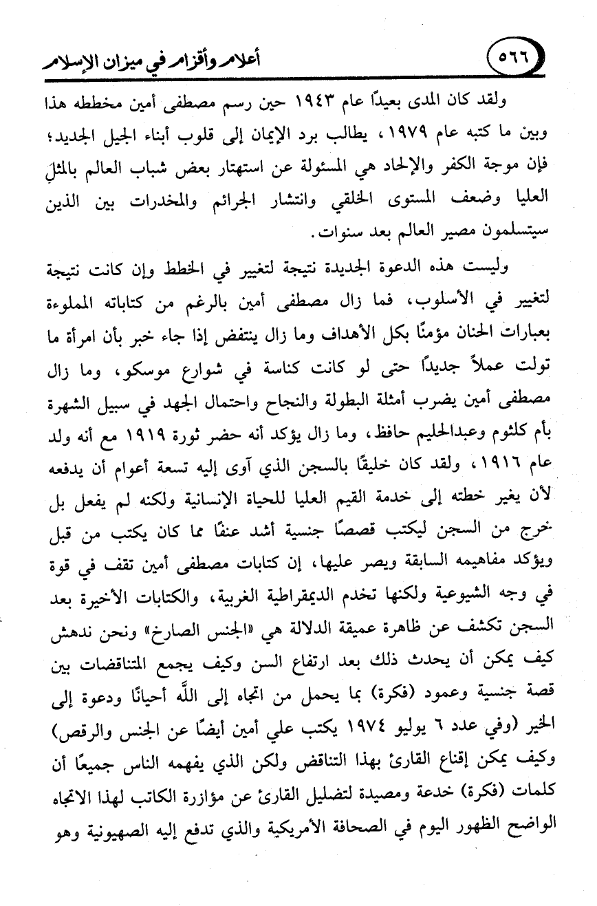 وليست هذه الدعوة الجديدة نتيجة لتغيير في الخطط وإن كانت نتيجة لتغيير في الأسلوب، فما زال مصطفى أمين بالرغم من كتاباته المملوءة بعبارات الحنان مؤمنًا بكل الأهداف وما زال ينتفض إذا جاء خبر بأن امرأة ما تولت عملاً جديدًا حتى لو كانت كناسة في شوارع موسكو، وما زال مصطفى أمين يضرب أمثلة البطولة والنجاح واحتمال الجهد في سبيل الشهرة بأم كلثوم وعبد الحليم حافظ، وما زال يؤكد أنه حضر ثورة 1919 مع أنه ولد عام 1916، ولقد كان خليقًا بالسجن الذي آوى إليه تسعة أعوام أن يدفعه لأن يغير خطته إلى خدمة القيم العليا للحياة الإنسانية ولكنه لم يفعل بل خرج من السجن ليكتب قصصًا جنسية أشد عنفًا مما كان يكتب من قبل ويؤكد مفاهيمه السابقة ويصر عليها، إن كتابات مصطفى أمين تقف في قوة في وجه الشيوعية ولكنها تخدم الديمقراطية الغربية، والكتابات الأخيرة بعد السجن تكشف عن ظاهرة عميقة الدلالة هي "الجنس الصارخ" ونحن ندهش كيف يمكن أن يحدث ذلك بعد ارتفاع السن وكيف يجمع المتناقضات بين قصة جنسية وعمود (فكرة) بما يحمل من اتجاه إلى الله أحيانًا ودعوة إلى الخير (وفي عدد 6 يوليو 1974 يكتب علي أمين أيضًا عن الجنس والرقص) وكيف يمكن إقناع القارئ بهذا التناقض ولكن الذي يفهمه الناس جميعًا أن كلمات (فكرة) خدعة ومصيدة لتضليل القارئ عن مؤازرة الكاتب لهذا الاتجاه الواضح الظهور اليوم في الصحافة الأمريكية والذي تدفع إليه الصهيونية وهو