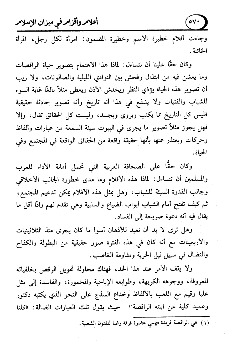 وكان حقًا علينا أن نتساءل: لماذا هذا الاهتمام بتصوير حياة الراقصات وما يعشن فيه من ابتذال وفحش بين النوادي الليلية والصالونات، ولا ريب أن تصوير هذه الحياة يؤذي النظر ويخدش الأذن ويعطى مثلاً بالغًا غاية السوء للشباب والفتيات ولا يشفع في هذا أنه تاريخ وأنه تصوير حادثة حقيقية فليس كل التاريخ مما يكتب ويروى ويجسد، وليست كل الحقائق تقال، وإلا فهل يجوز مثلاً تصوير ما يجرى في البيوت سيئة السمعة من عبارات وألفاظ وحركات ويعتذر عنها بأنها حقيقة واقعة من الحقائق الواقعة في المجتمع وفي الحياة.