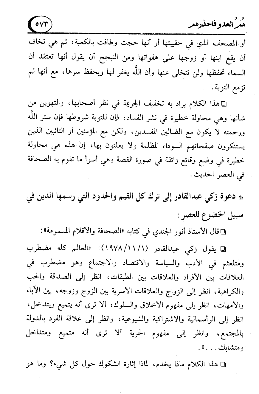 - هذا الكلام يراد به تخفيف الجريمة في نظر أصحابها، والتهوين من شأنها وهي محاولة خطيرة في نشر الفساد؛ فإن للتوبة شروطها فإن ستر الله ورحمته لا يكون مع الضالين المفسدين، ولكن مع المؤمنين أو التائبين الذين يستنكرون صفحاتهم السوداء المظلمة ولا يعلنون بها، إن هذه هي محاولة خطيرة في وضع وقائع زائفة في صورة القصة وهي أسوأ ما تقوم به الصحافة في العصر الحديث.