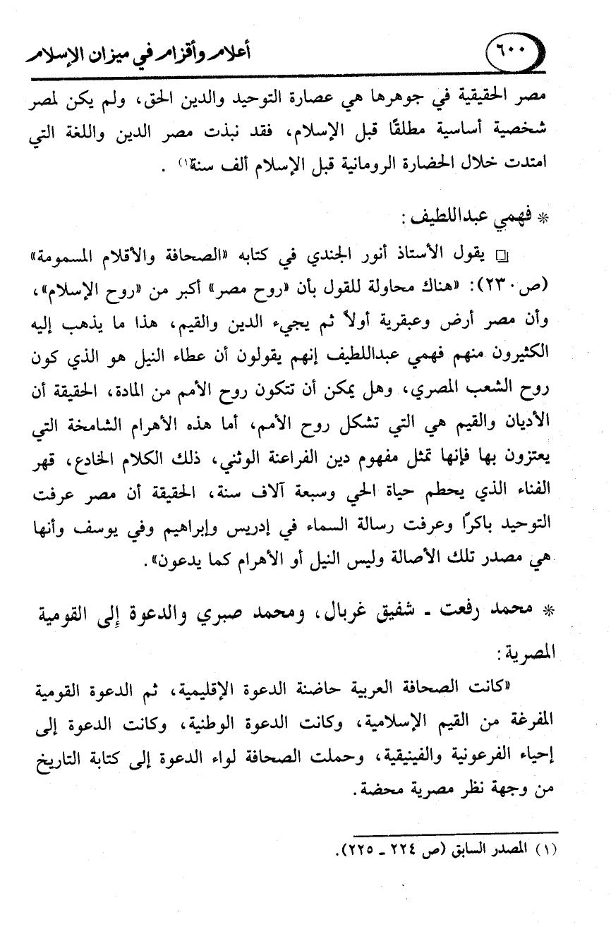 - يقول الأستاذ أنور الجندي في كتابه "الصحافة والأقلام المسمومة" (ص 230): "هناك محاولة للقول بأن "روح مصر" أكبر من "روح الإسلام"، وأن مصر أرض وعبقرية أولاً ثم يجيء الدين والقيم، هذا ما يذهب إليه الكثيرون منهم فهمي عبد اللطيف إنهم يقولون أن عطاء النيل هو الذي كون روح الشعب المصري، وهل يمكن أن تتكون روح الأمم من المادة، الحقيقة أن الأديان والقيم هي التي تشكل روح الأمم، أما هذه الأهرام الشامخة التي يعتزون بها فإنها تمثل مفهوم دين الفراعنة الوثني، ذلك الكلام الخادع، قهر الفناء الذي يحطم حياة الحي وسبعة آلاف سنة، الحقيقة أن مصر عرفت التوحيد باكرًا وعرفت رسالة السماء في إدريس وإبراهيم وفي يوسف وأنها هي مصدر تلك الأصالة وليس النيل أو الأهرام كما يدعون".