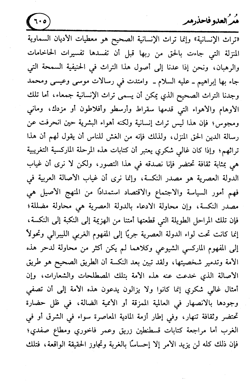 "تراث الإنسانية" وإنما تراث الإنسانية الصحيح هو معطيات الأديان السماوية المنزلة التي جاءت بالحق من ربها قبل أن تفسدها تفسيرات الحاخامات والرهبان، ونحن إذا عدنا إلى أصول هذا التراث في الحنيفية السمحة التي جاء بها إبراهيم -عليه السلام- وامتدت في رسالات موسى وعيسى ومحمد وجدنا التراث الصحيح الذي يمكن أن يسمى تراث الإنسانية جمعاء، أما تلك الأوهام والأهواء التي قدمها سقراط وأرسطو وأفلاطون أو مزدك، وماني ومجوس؛ فإن هذا ليس تراث إنسانية ولكنه أهواء البشرية حين انحرفت عن رسالة الدين الحق المنزل، ولذلك فإنه من الغش للناس أن يقول لهم أن هذا تراثهم؛ وإذا كان غالي شكري يعتبر أن كتابات هذه المرحلة الماركسية التغريبية هي بمثابة ثقافة تحتضر فإنا نصدقه في هذا التصور، ولكن لا نرى أن غياب الدولة العصرية هو مصدر النكسة، وإنما نرى أن غياب الأصالة العربية في فهم أمور السياسة والاجتماع والاقتصاد استمدادًا من المنهج الأصيل هي مصدر النكسة، وإن محاولة الادعاء بالدولة العصرية هي محاولة مضللة؛ فإن تلك المراحل الطويلة التي قطعتها أمتنا من الهزيمة إلى النكبة إلى النكسة، إنما كانت تحت لواء الدولة العصرية جريًا إلى المفهوم الغربي الليبرالي وتحولاً إلى المفهوم الماركسي الشيوعي وكلاهما لم يكن أكثر من محاولة لدحر هذه الأمة وتدمير شخصيتها، ولقد تبين بعد النكسة أن الطريق الصحيح هو طريق الأصالة الذي خدعت عنه هذه الأمة بتلك المصطلحات والشعارات، وإن أمثال غالي شكري إنما كانوا ولا يزالون يدعون هذه الأمة إلى أن تصفي وجودها بالانصهار في العالمية الممزقة أو الأممية الضالة، في ظل حضارة تحتضر وثقافة تنهار، وفي إطار أزمة المادية المعاصرة سواء في الشرق أو في الغرب أما مراجعة كتابات قسطنطين زريق وعمر فاخوري ومطاع صفدي؛ فإن ذلك كله لن يزيد الأمر إلا إحساسًا بالغربة وتجاوز الحقيقة الواقعة، فتلك