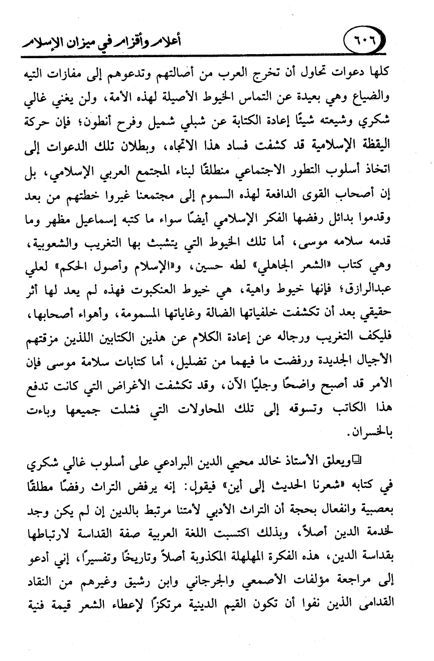 كلها دعوات تحاول أن تخرج العرب من أصالتهم وتدعوهم إلى مفازات التيه والضياع وهي بعيدة عن التماس الخيوط الأصيلة لهذه الأمة، ولن يغني غالي شكري وشيعته شيئًا إعادة الكتابة عن شبلي شميل وفرح أنطون؛ فإن حركة اليقظة الإسلامية قد كشفت فساد هذا الاتجاه، وبطلان تلك الدعوات إلى اتخاذ أسلوب التطور الاجتماعي منطلقًا لبناء المجتمع العربي الإسلامي، بل إن أصحاب القوى الدافعة لهذه السموم إلى مجتمعنا غيروا خطتهم من بعد وقدموا بدائل رفضها الفكر الإسلامي أيضًا سواء ما كتبه إسماعيل مظهر وما قدمه سلامه موسى، أما تلك الخيوط التي يتشبث بها التغريب والشعوبية، وهي كتاب "الشعر الجاهلي" لطه حسين، و"الإسلام وأصول الحكم" لعلي عبد الرازق؛ فإنها خيوط واهية، هي خيوط العنكبوت فهذه لم يعد لها أثر حقيقي بعد أن تكشفت خلفياتها الضالة وغاياتها المسمومة، وأهواء أصحابها، فليكف التغريب ورجاله عن إعادة الكلام عن هذين الكتابين اللذين مزقتهم الأجيال الجديدة ورفضت ما فيهما من تضليل، أما كتابات سلامة موسى فإن الأمر قد أصبح واضحاً وجليًا الآن، وقد تكشفت الأغراض التي كانت تدفع هذا الكاتب وتسوقه إلى تلك المحاولات التي فشلت جميعها وباءت بالخسران.